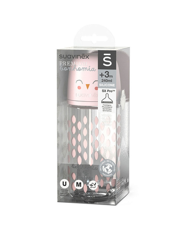 Антиколиковая стеклянная бутылочка Suavinex Bonhomia с силиконовой физиологической соской SX Pro делает процесс кормления максимально естественным и помогает предотвратить возникновение коликов.