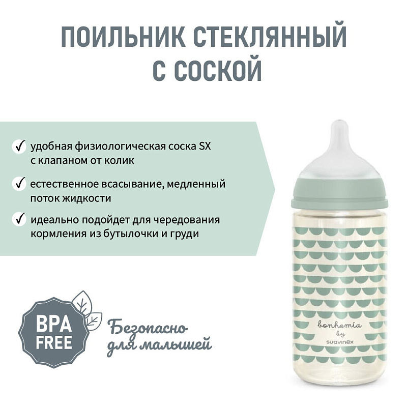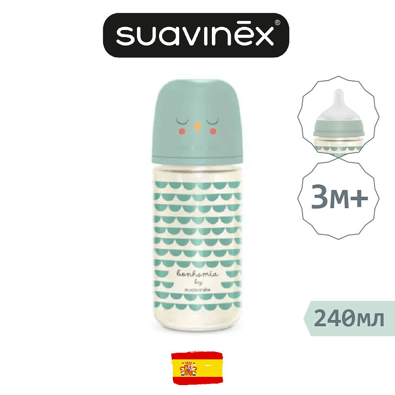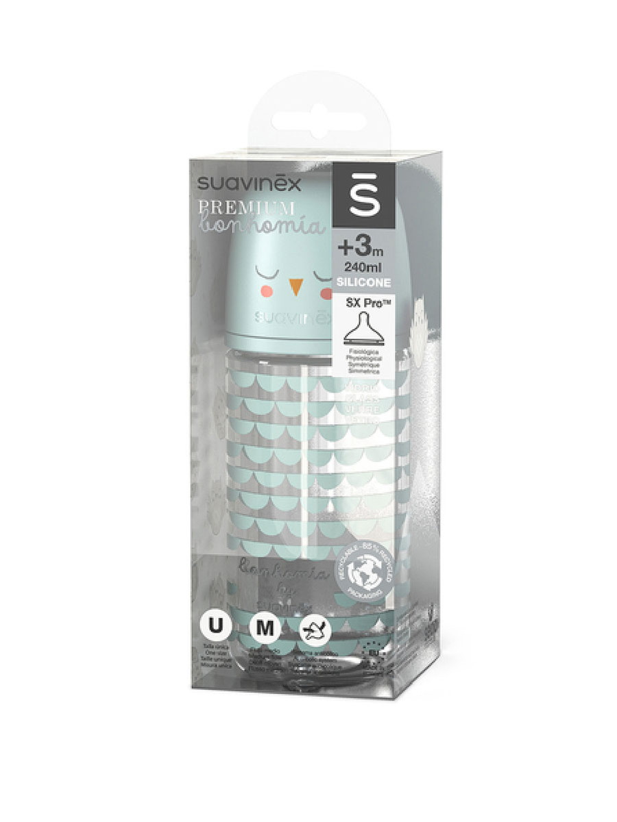 Антиколиковая стеклянная бутылочка Suavinex Bonhomia с силиконовой физиологической соской SX Pro делает процесс кормления максимально естественным и помогает предотвратить возникновение коликов.