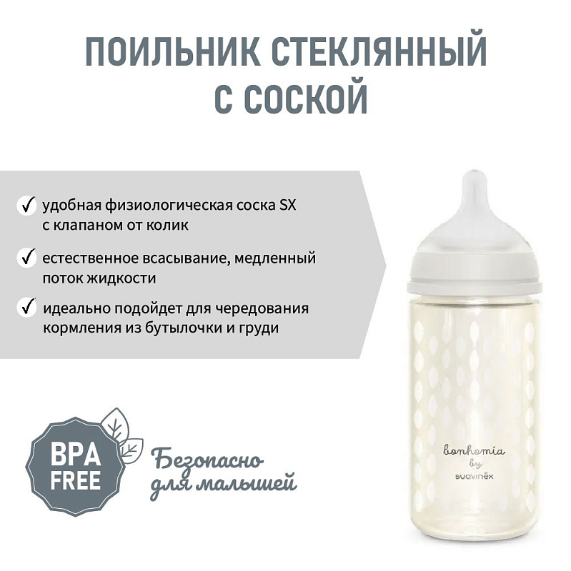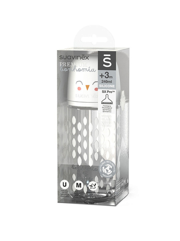 Антиколиковая стеклянная бутылочка Suavinex Bonhomia с силиконовой физиологической соской SX Pro делает процесс кормления максимально естественным и помогает предотвратить возникновение коликов.