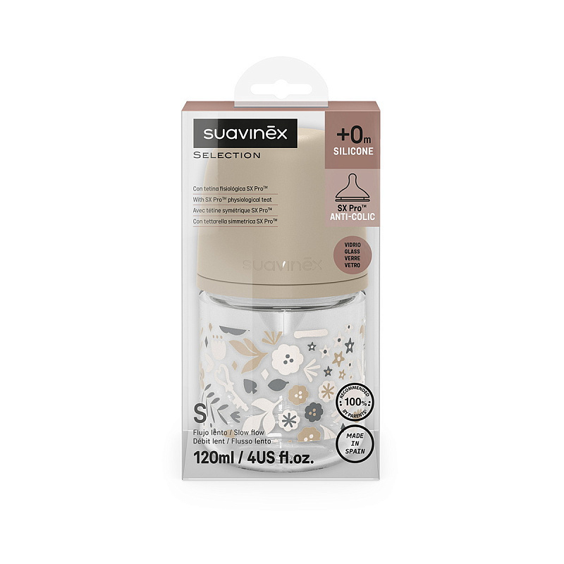 Антиколиковая стеклянная бутылочка SUAVINEX с силиконовой физиологической соской SX Pro делает процесс кормления максимально естественным и помогает предотвратить возникновения коликов.