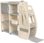 Стеллаж для игрушек с ящиками и полками выполнен из качественного пластика. Данный материал экологичен и прост в чистке. Небольшой вес стеллажа и его устойчивая конструкция обеспечивают ребёнку безопасность от ушибов.