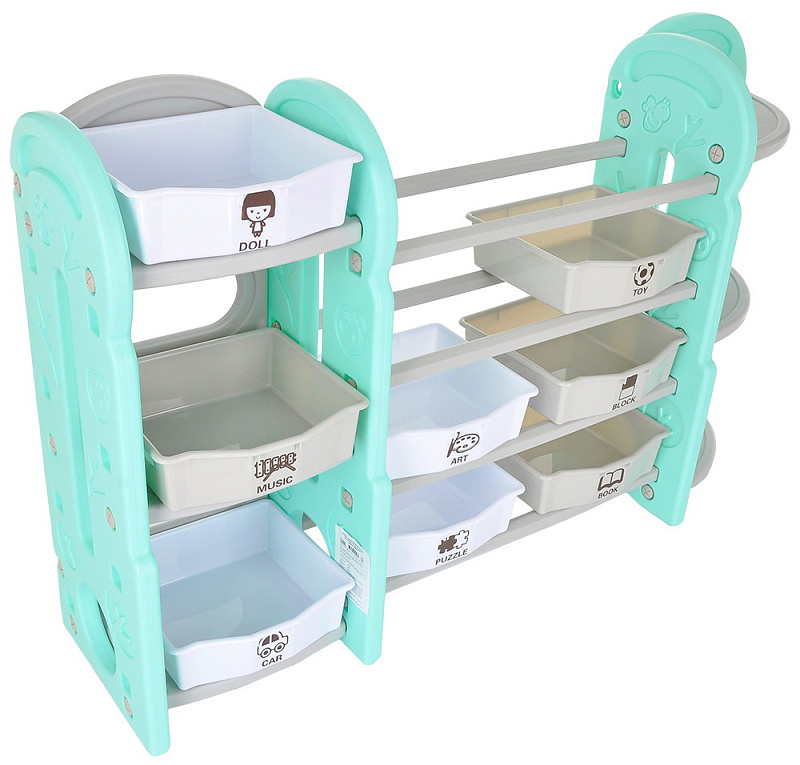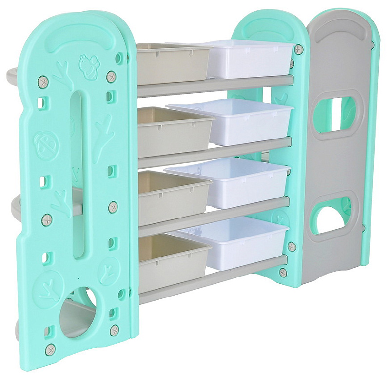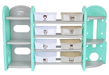 Стеллаж для игрушек с ящиками и полками выполнен из качественного пластика. Данный материал экологичен и прост в чистке. Небольшой вес стеллажа и его устойчивая конструкция обеспечивают ребёнку безопасность от ушибов.