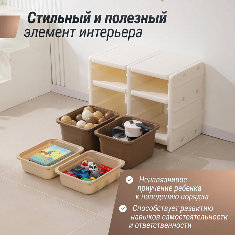 Качественный пластик, из которого изготовлен этот стеллаж, не содержит вредных веществ и не выбрасывает вредных испарений, что делает его безопасным для здоровья детей. Кроме того, материал, используемый для производства стеллажа, легкий и прочный, что позволяет удобно перемещать его по комнате и не оставлять на полу царапин и следов.