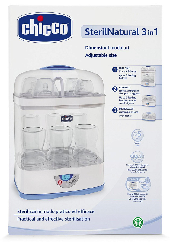 Устранить до 99,9% микробов с бутылочек, сосок, молокоотсосов и прочих аксессуаров по уходу за крохой поможет компактный цифровой стерилизатор Chicco Sterilnatural 3 в 1 – купить изделие по оптимальной цене можно прямо сейчас в нашем интернет-магазине.