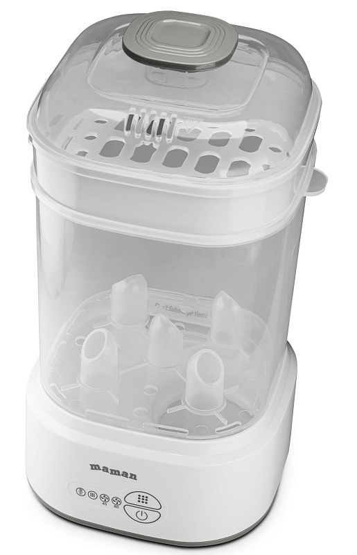 Стерилизатор предназначен для стерилизации паром детских бутылочек, деталей молокоотсоса, а также аксессуаров для кормления малыша. Сушка горячим воздухом полностью удаляет влагу с предметов, после чего они сразу готовы к использованию.