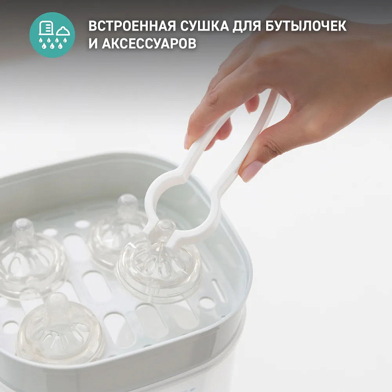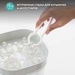 Стерилизует все виды бутылок. Небольшая детская посуда, а также аксессуары для молокоотсосов могут быть размещены в специальном отсеке.