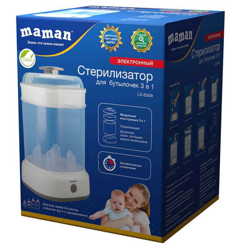 - Стерилизатор предназначен для стерилизации паром детских бутылочек, деталей молокоотсоса, а также других аксессуаров для кормления малыша.