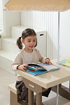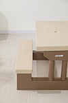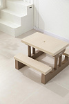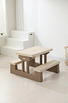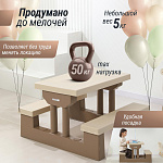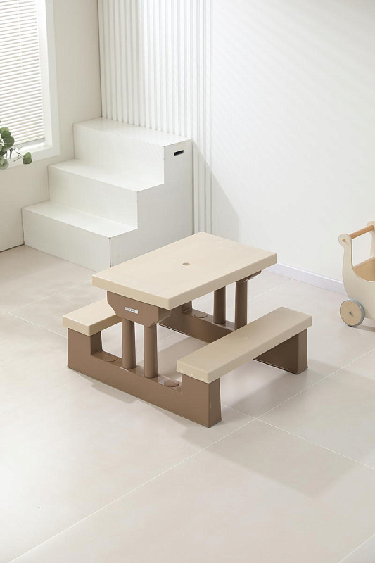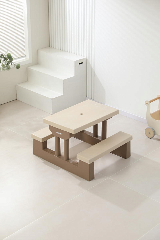 Универсальность набора мебели для детей заключается в компактных размерах столешницы, позволяющих комфортно расположить игрушки, посуду или материалы для творчества, и двух удобных лавочках, рассчитанных на размещение детей различных возрастных групп. Округлая форма углов минимизирует риск случайных травм и повреждений.