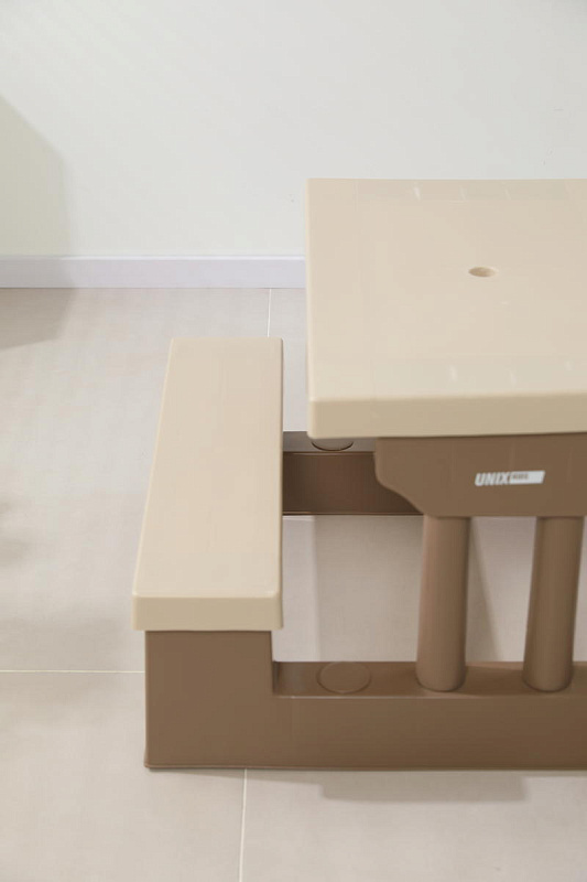 Одним из ключевых преимуществ детского столика со скамейками из пластика является малый вес конструкции (всего 5 кг), облегчающий его перемещение. Комплект садовой мебели UNIX Kids Garden производен из высококачественного пищевого пластика, прошедшего сертификацию в соответствии с международными стандартами. Материал характеризуется высокой степенью защиты от воздействия атмосферных осадков и загрязнений, а также простотой ухода — поверхность изделий легко очищается обычной водой, сохраняя эстетичный внешний вид на протяжении длительного периода эксплуатации.