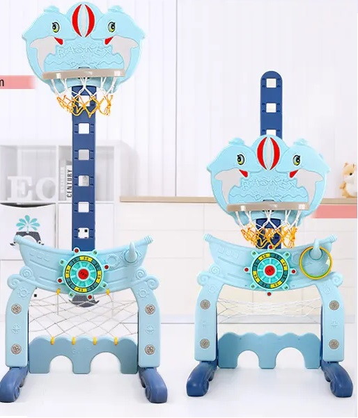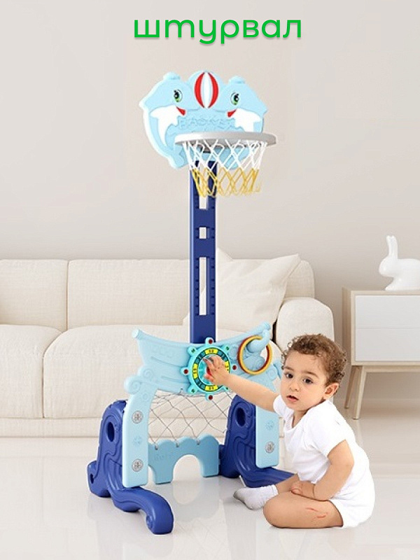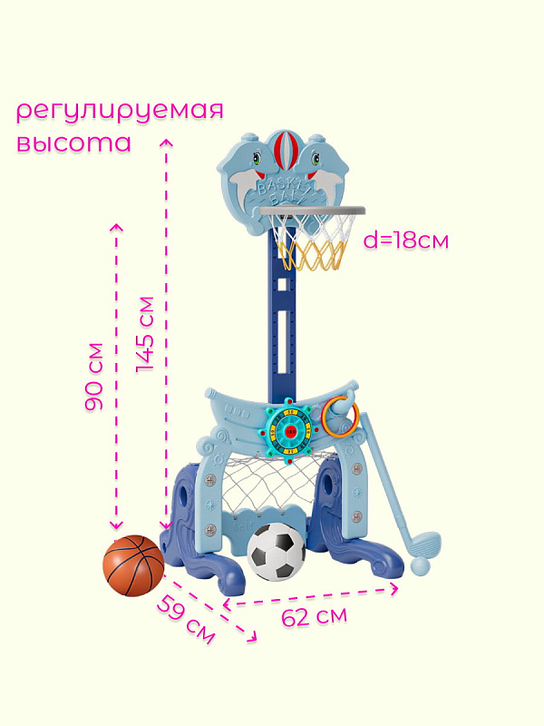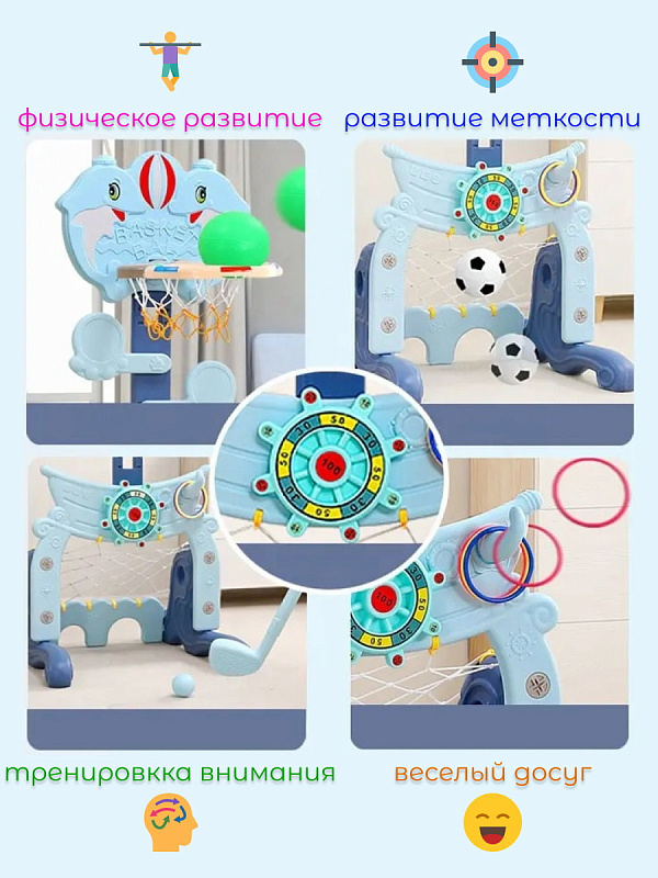 Это удачное приобретение, так как представляет собой мини спортивную площадку, так как можно играть в баскетбол, футбол и даже в гольф, в комплект входят 3 мяча - для футбола, баскетбола и для гольфа, клюшка для гольфа. Ваш малыш разовьёт ловкость, внимательность, координацию движения.