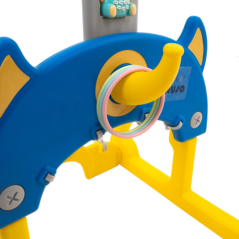В комплект входят: мячи - 3 штуки (1-для гольфа, 1 (д.11см)-для баскетбола,1 (д.11см)-для футбола), клюшка для гольфа, кольца– 3 штуки).