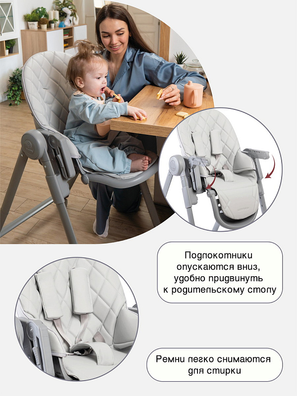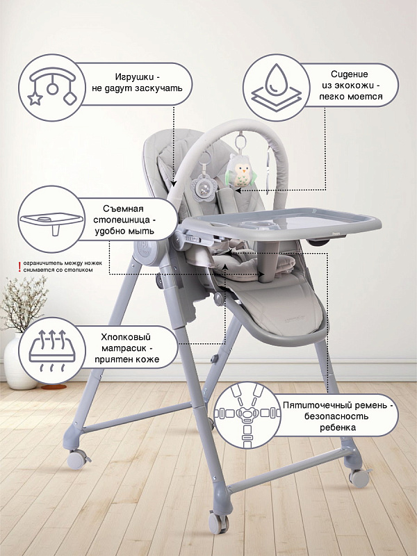 Безопасность для ребенка – стульчик оборудован пятиточечными ремнями с мягкими накладками. Ремни можно снять для очистки.