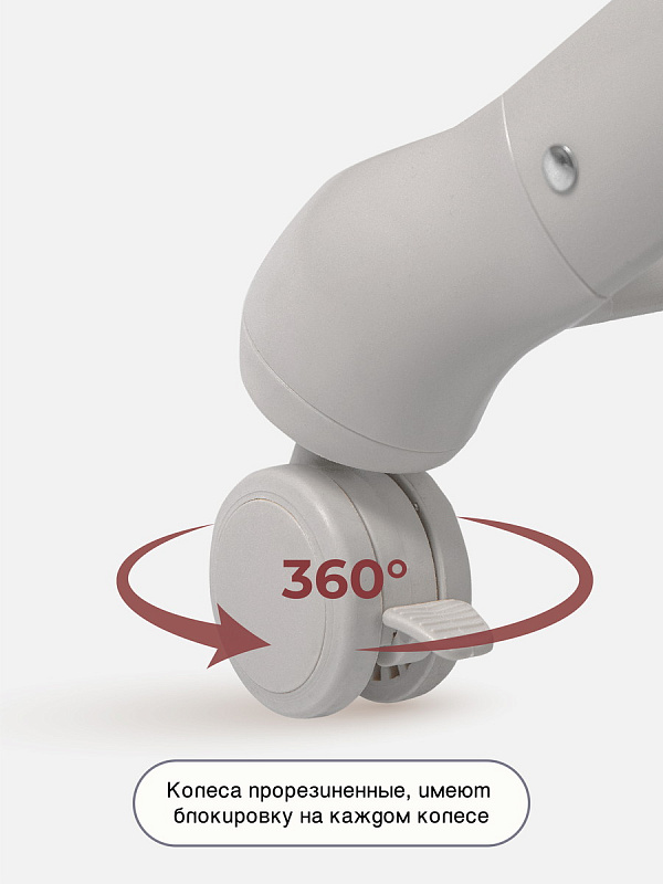 Колеса прорезиненные, крутятся на 360 градусов и имеют блокировку на каждом колесе.