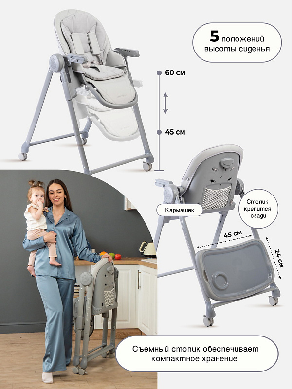 Высоту сиденья можно регулировать в 5 положениях в диапазоне 45-60 см от пола.