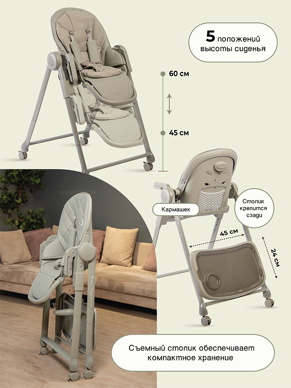 Высоту сиденья можно регулировать в 5 положениях в диапазоне 45-60 см от пола.