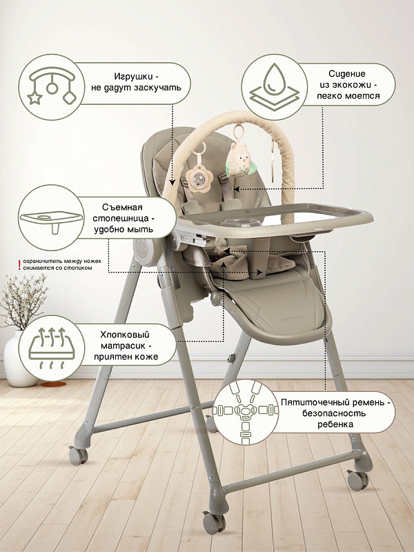 Безопасность для ребенка – стульчик оборудован пятиточечными ремнями с мягкими накладками. Ремни можно снять для очистки.