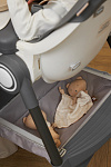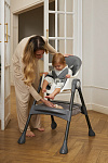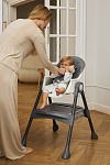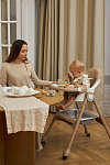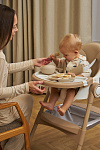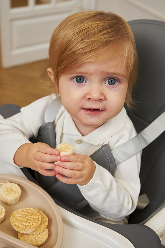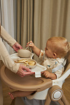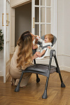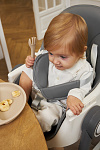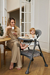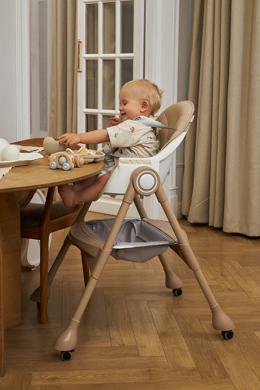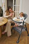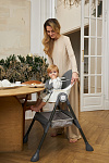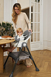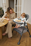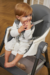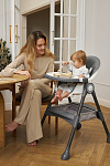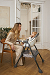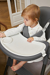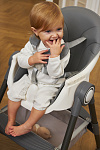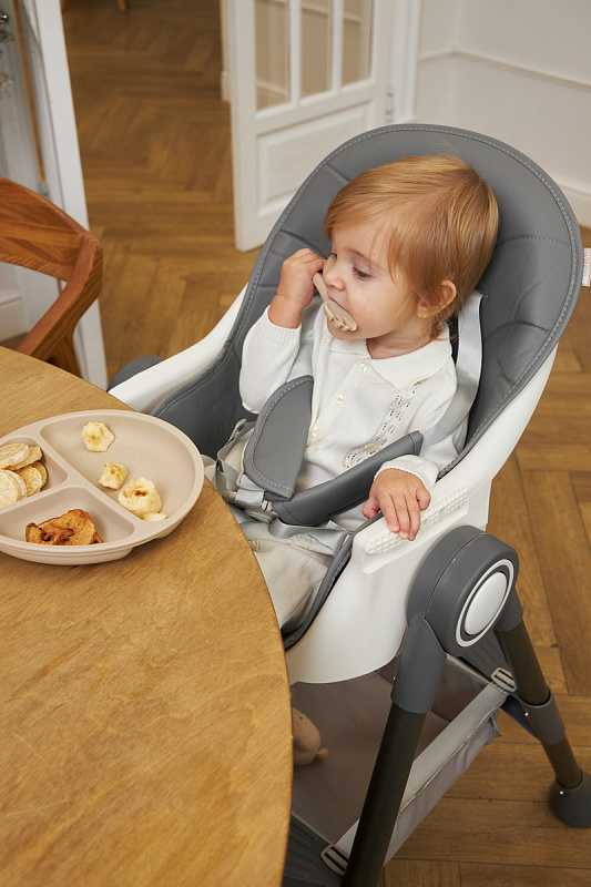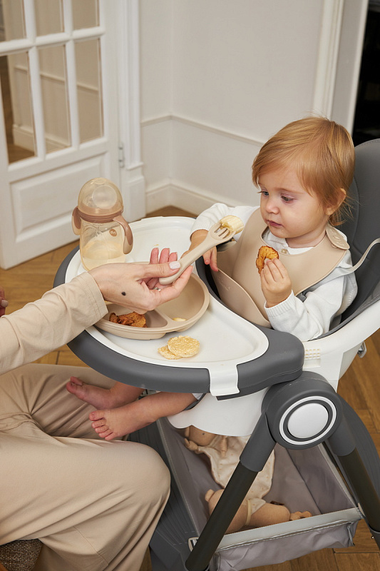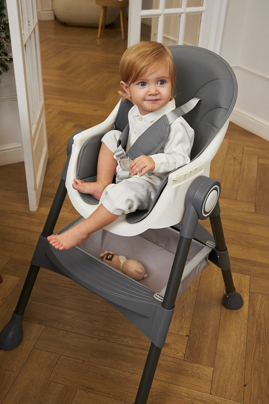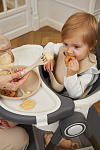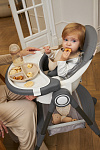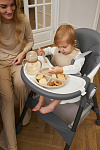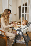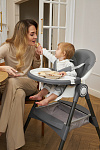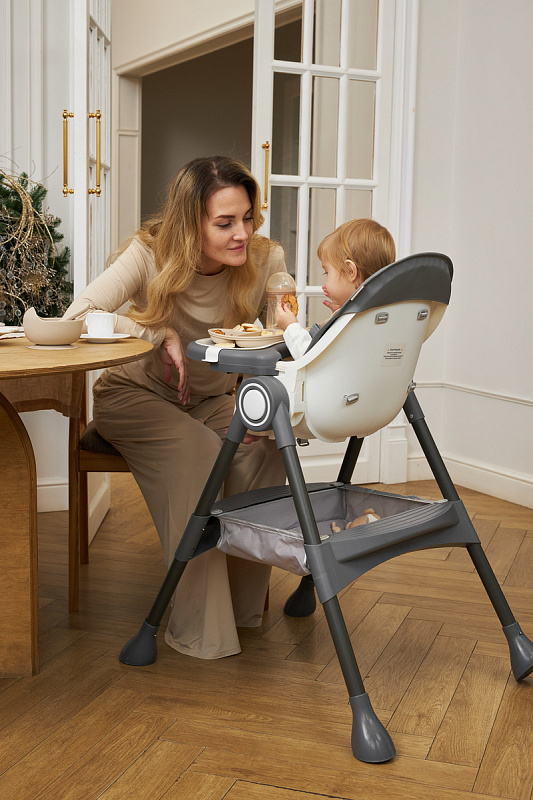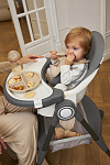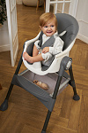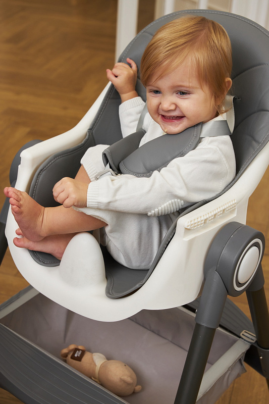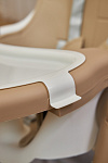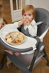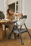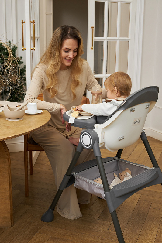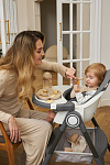 Дополнительные удобства обеспечиваются съемным органайзером для любимых игрушек ребенка, съемным столиком с регулировкой по глубине и дополнительным подносом-вкладышем, которые позволяют разместить необходимые предметы рядом с крохой, предотвращая хаос вокруг места приема пищи. Углубление под бутылочку гарантирует безопасность и удобство питья.