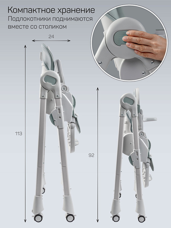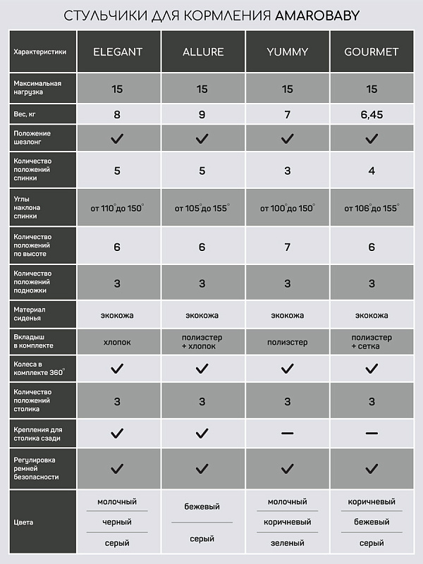 Стульчик для кормления AmaroBaby Yummy — это сочетание удобства и стиля для вашего малыша. Универсальный стульчик оснащён регулировкой по высоте для комфортного размещения за столом, сиденье плавно трансформируется в положение шезлонга, обеспечивая малышу удобный отдых. Подножка и столик также регулируются, подстраиваясь под потребности ребёнка. В комплект детского стула входит мягкий вкладыш для дополнительного комфорта. Чехол выполнен из практичной экокожи в cпокойных монохромных оттенках, что придаёт стульчику современный и стильный внешний вид. Детский стульчик можно легко передвигать по комнате за счет бесшумных поворотных колес. Стул для малыша не занимает много места на кухне, легко складывается, очень мало весит. Изготовлен из прочного качественного пластика, который безопасен для ребенка.