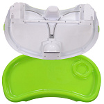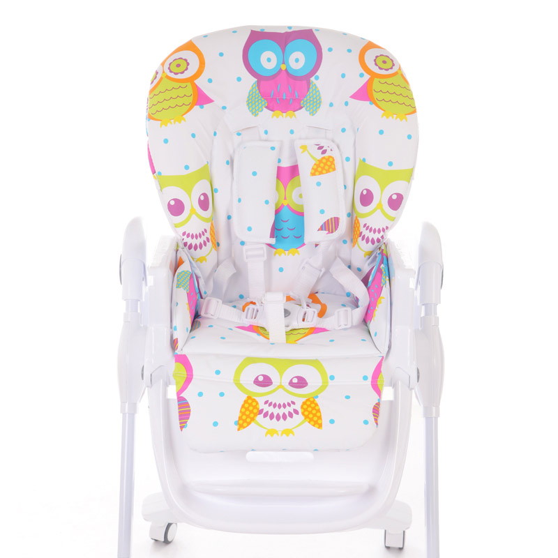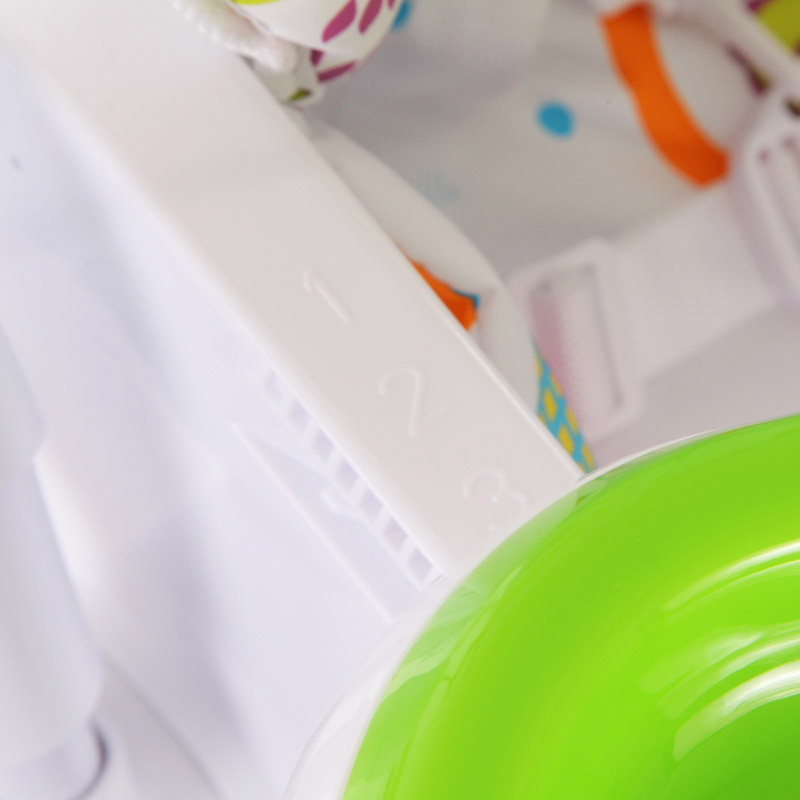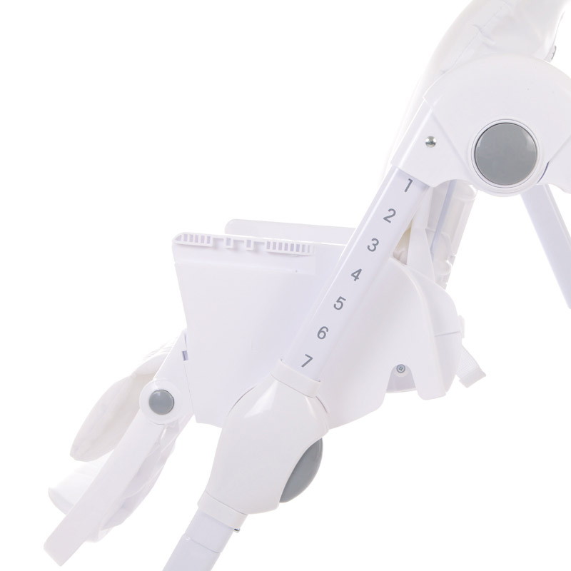 Высота стульчика настраивается индивидуально, в зависимости от ситуации. Ребенка фиксируют 5-точечные ремни безопасности и поднос-ограничитель, также выполняющий роль платформы для детских кушаний и напитков.