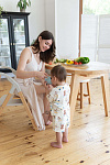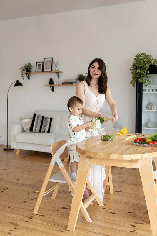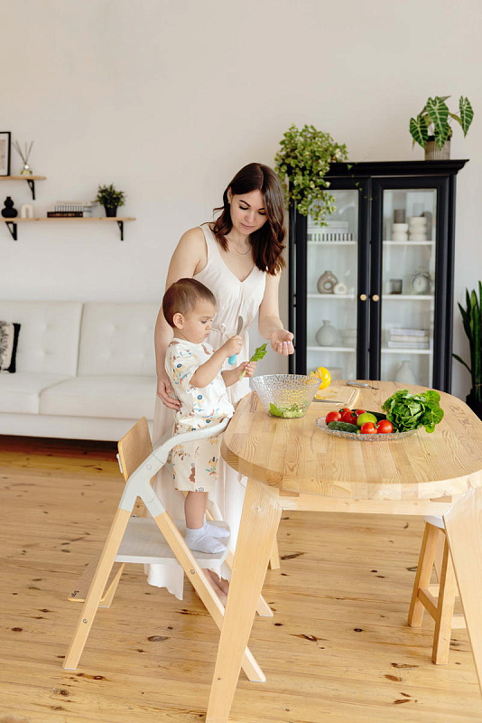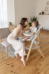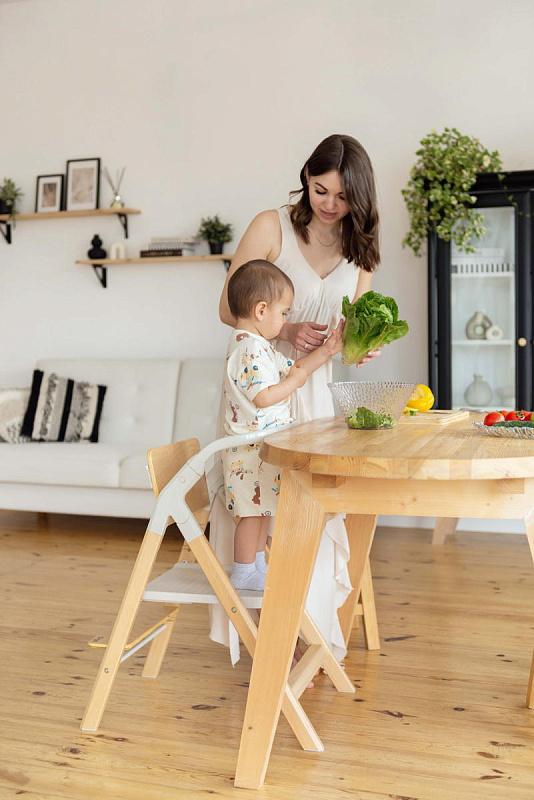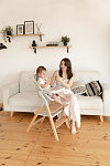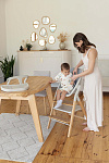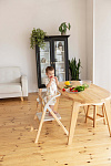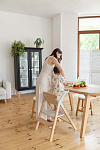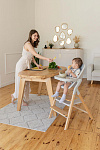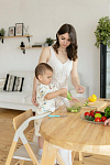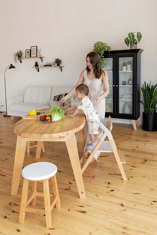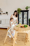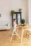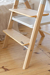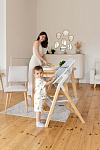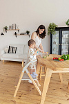 И, наконец, наиболее уникальная функция – **обучающая башня**. Максимальная нагрузка на платформу составляет 75 кг, что позволяет использовать ее не только детям, но и взрослым для наблюдения за процессом готовки или других домашних дел. Надежный металлический подлокотник и деревянный ограничитель обеспечивают безопасность ребенка, позволяя ему чувствовать себя уверенно и комфортно. Пластиковая платформа, на которой ребенок стоит, обеспечивает надежное и безопасное основание. Габаритные размеры всего стульчика (ДхШхВ): 64х48х88 см. Наклон спинки регулируется в 3 положениях, а наклон подножки – в 5 положениях. В качестве дополнительного элемента безопасности выступают 5-точечные ремни. Размеры табурета (ВхШхГ): 47/44/40х39х20 см.