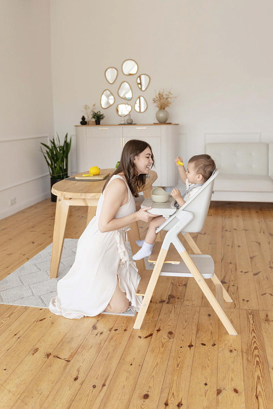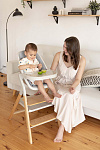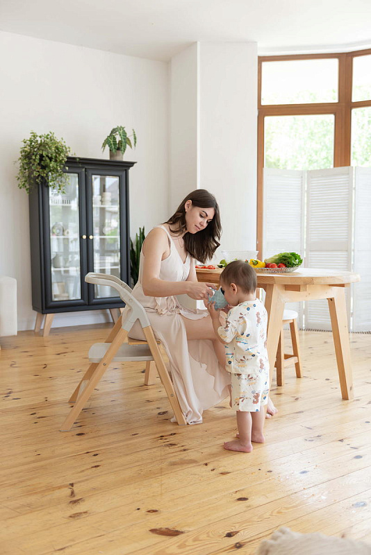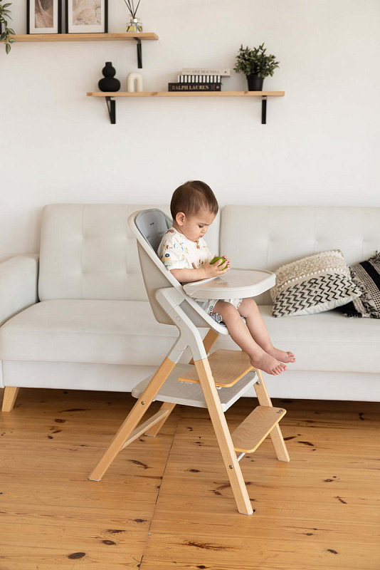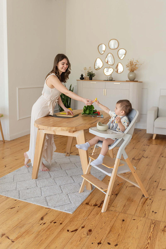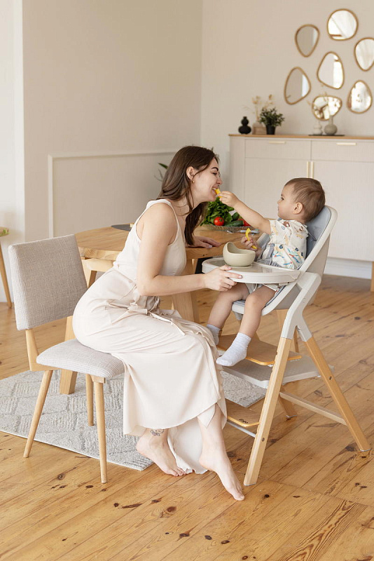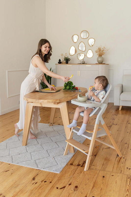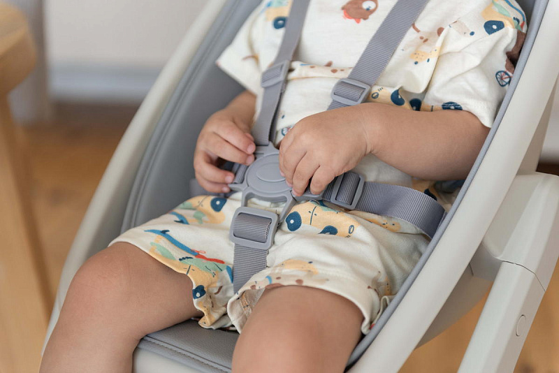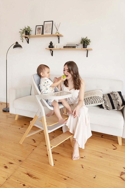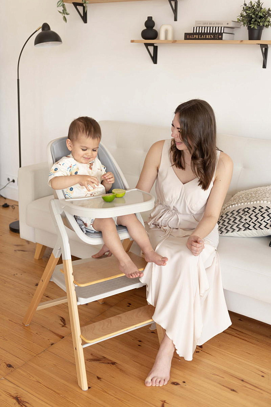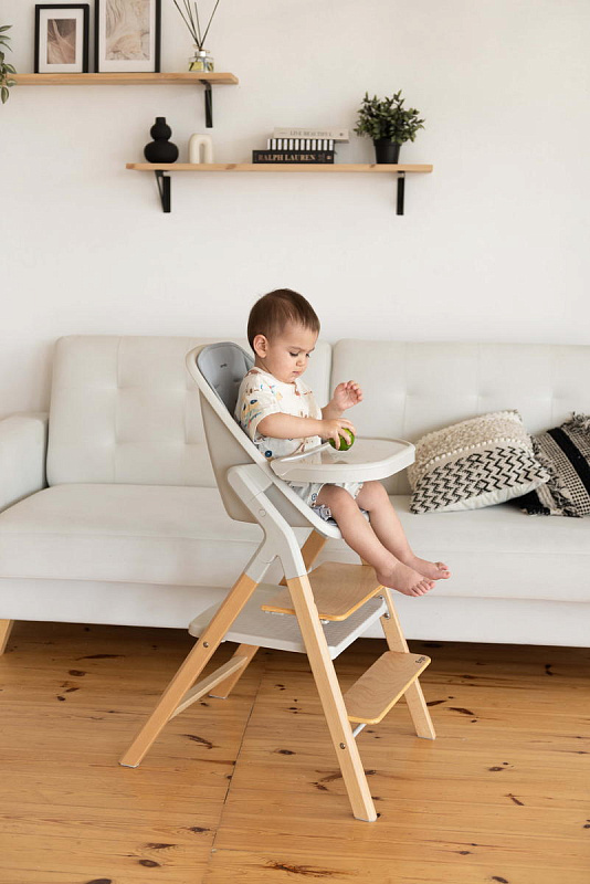 Далее, трансформируясь, изделие превращается в **стульчик для кормления**, предназначенный для детей от 6 месяцев до 15 кг. В этом режиме используется эргономичное сиденье из пластика, обеспечивающее правильную осанку ребенка во время приема пищи. Ограничительный бампер и пятиточечные ремни безопасности гарантируют безопасность малыша. Столешница с подносом имеет две позиции регулировки по высоте, что позволяет адаптировать ее под рост ребенка. Регулируемая подножка в трех положениях обеспечивает максимальное удобство для ног. Пластиковая платформа стульчика дополнительно усиливает его устойчивость.