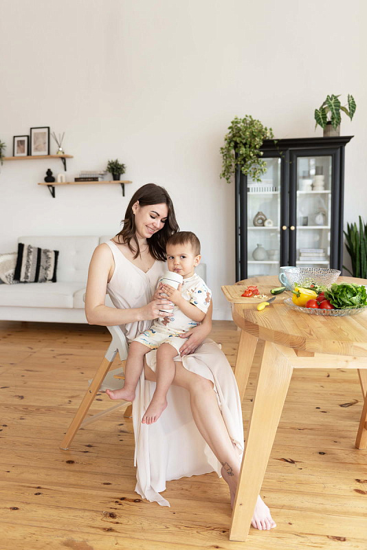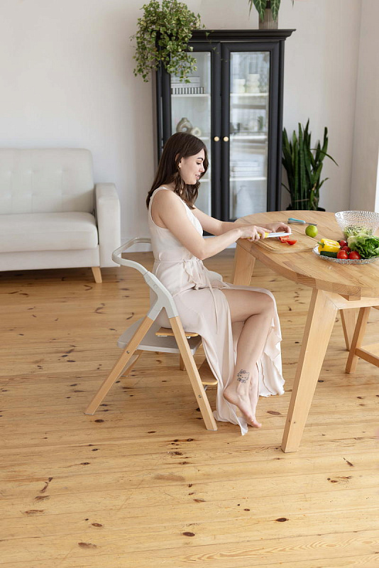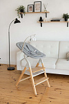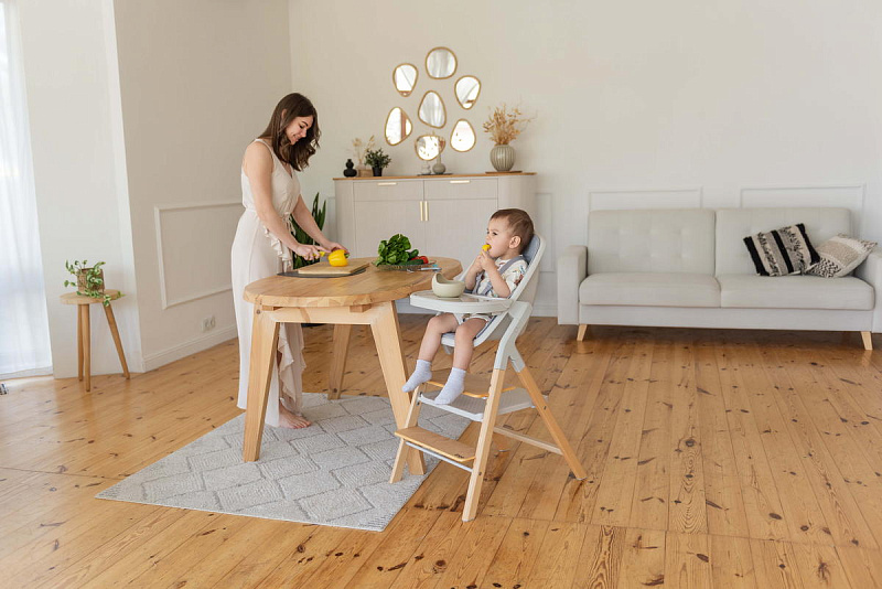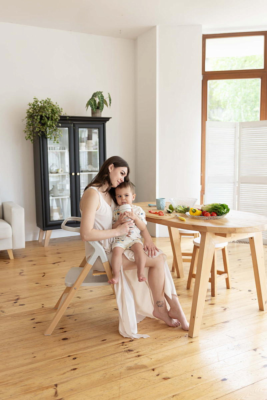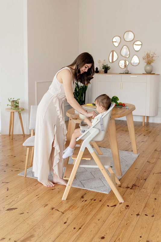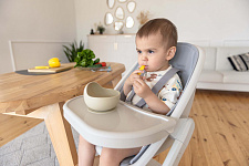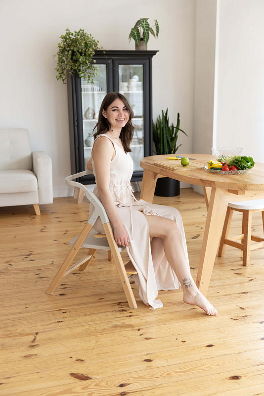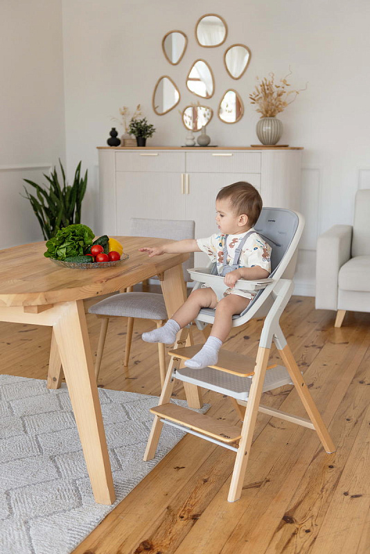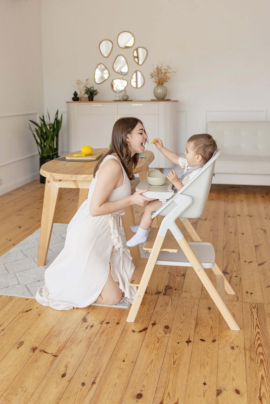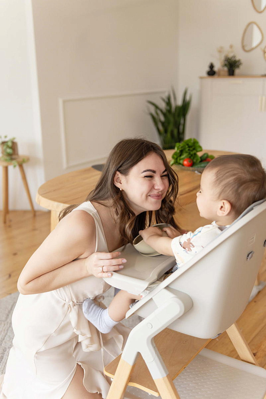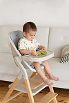 Далее, трансформируясь, изделие превращается в **стульчик для кормления**, предназначенный для детей от 6 месяцев до 15 кг. В этом режиме используется эргономичное сиденье из пластика, обеспечивающее правильную осанку ребенка во время приема пищи. Ограничительный бампер и пятиточечные ремни безопасности гарантируют безопасность малыша. Столешница с подносом имеет две позиции регулировки по высоте, что позволяет адаптировать ее под рост ребенка. Регулируемая подножка в трех положениях обеспечивает максимальное удобство для ног. Пластиковая платформа стульчика дополнительно усиливает его устойчивость.