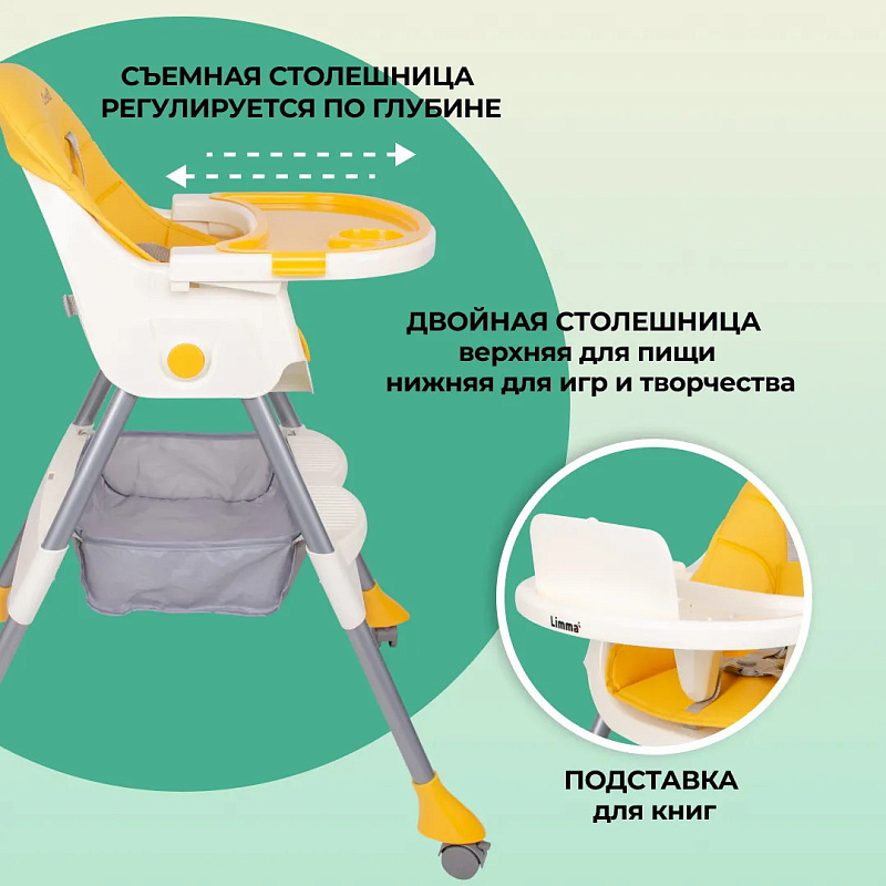 • Столешница имеет 3 позиции по глубине регулировки (вплотную малышу или подальше). Столешница полностью съемная, её можно разместить на задней части стульчика.