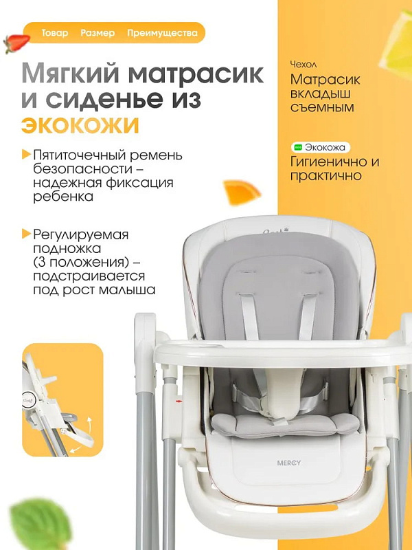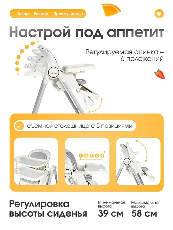 Идеальный помощник для родителей, стульчик COSTA Mercy создан для детей от 6 месяцев до 3 лет. Он обеспечивает удобное и безопасное кормление, а благодаря продуманной конструкции легко адаптируется под потребности растущего ребенка. А еще он умеет качаться – теперь малыш может не только кушать, но и весело проводить время!