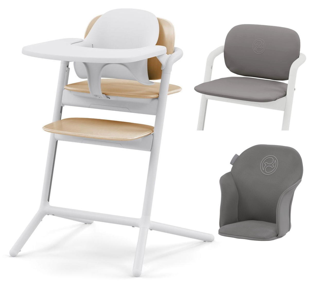 CYBEX предлагает следующие аксессуары: подставку-качалку LEMO, комфортную вставку LEMO, ремни безопасности LEMO и комплект обучающей башни LEMO. Цвета большинства аксессуаров совпадают с цветами стула Lemo Chair, за исключением ремня LEMO, который доступен только в светло-сером цвете.