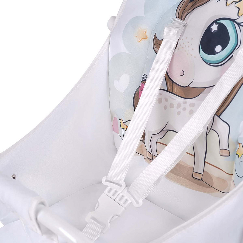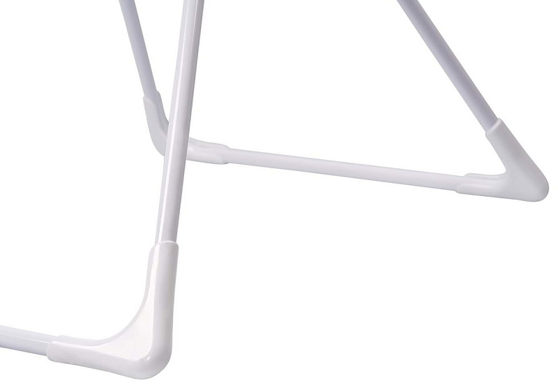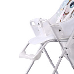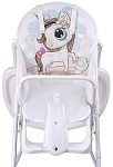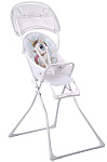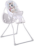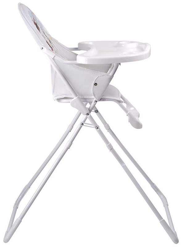 Мягкий чехол изготовлен из легко моющейся ткани — для уборки достаточно протереть его влажной тряпкой. Безопасность малыша обеспечивают тканевая перемычка между ножками и трёхточечный ремень. Внизу расположена удобная подножка для поддержки ног. Прочная столешница из пластика имеет бортики и специальные углубления для посуды, что облегчает кормление и защищает пол от случайно пролитых жидкостей. Столешница при необходимости снимается — ребёнка можно посадить за общий стол.