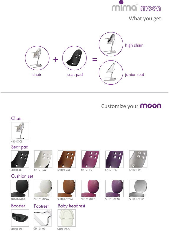 Стульчик Mima Moon это продукт 3 в 1 , включает в себя шезлонг для новорожденного,высокий стульчик с регулируем наклоном,и детское кресло. В ножке стульчика используется пневматический цилиндр ,что делает регулировку стула по высоте более мягче и удобнее.