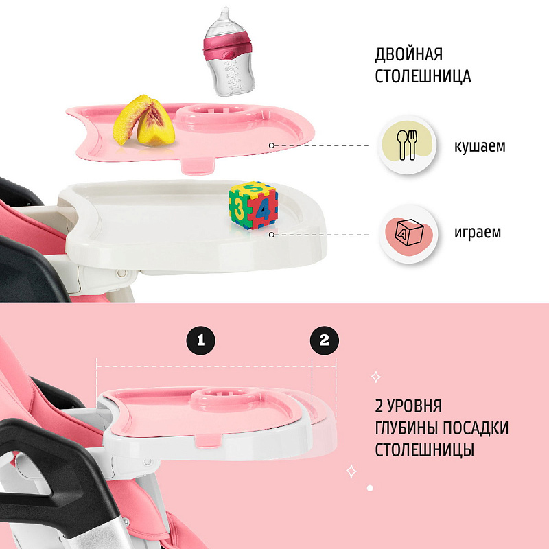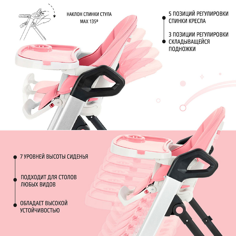 Стульчик-трансформер для кормления имеет множество регулировок. Изготовлен из качественных и прочных материалов. По мере роста ребёнка модель можно использовать не только для приёма пищи, а также для игр, занятий творчеством или в качестве шезлонга для отдыха. Изделие дополнено четырьмя колёсиками для удобства перемещения по дому, они дополнены мягким покрытием и не царапают пол.