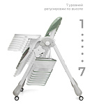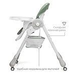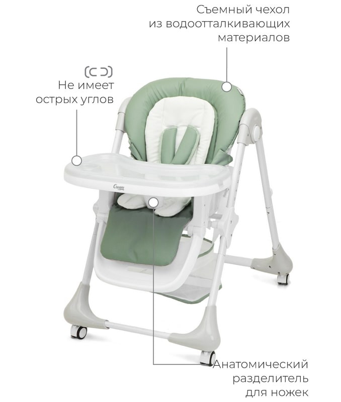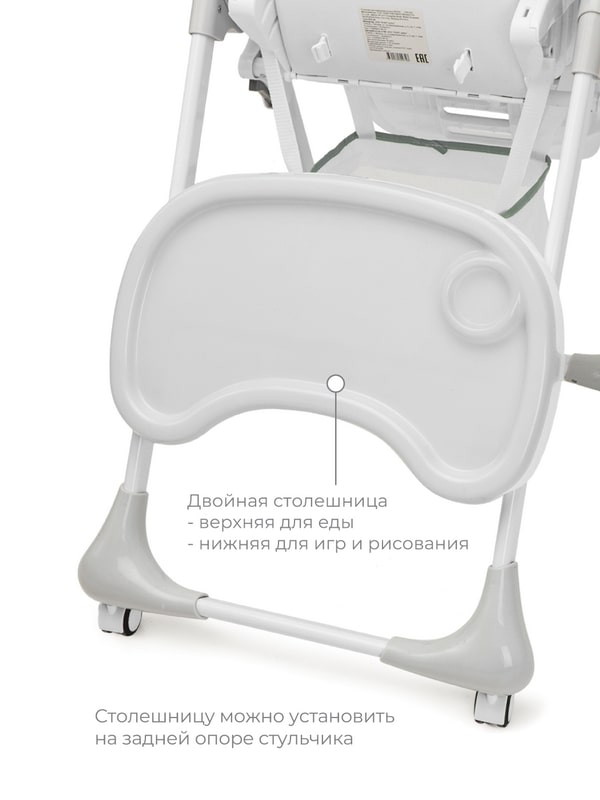 Стульчик для кормления выполнен из качественных материалов, конструкция не имеет острых углов. Сидение произведено из водоотталкивающих материалов, что облегчает уборку после еды. Двойная столешница съёмная, регулируется по высоте. Разделитель для ножек предотвратит соскальзывание ребенка.