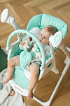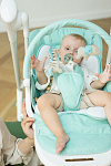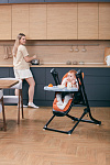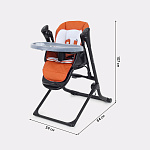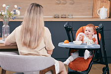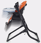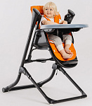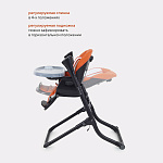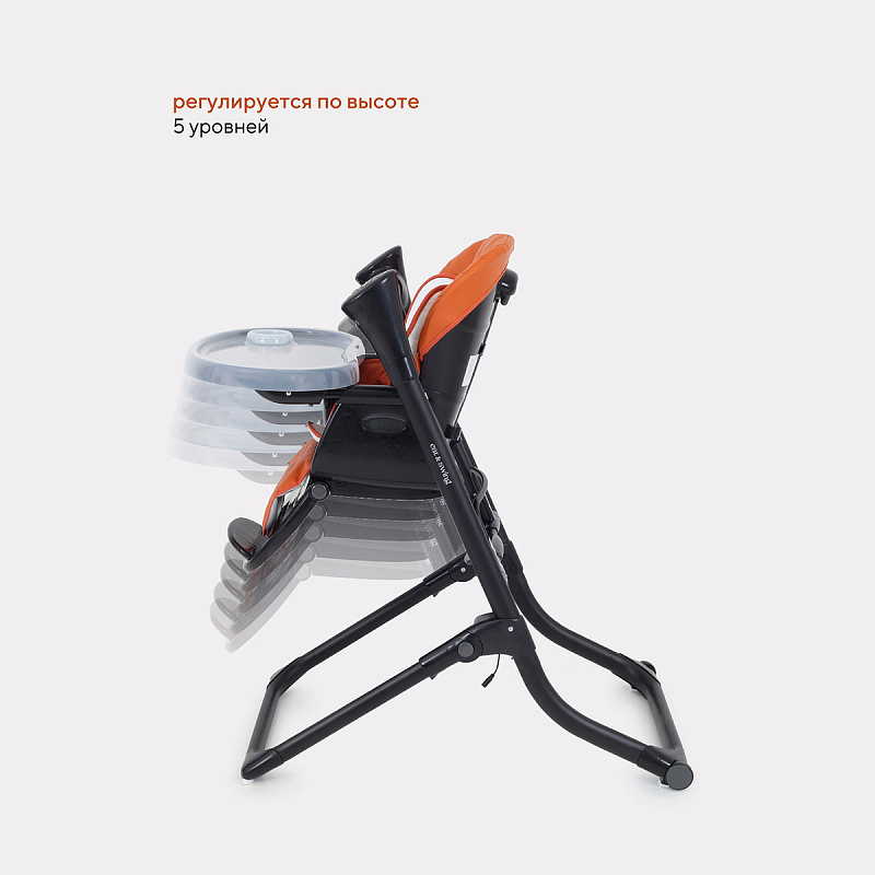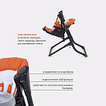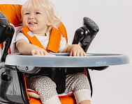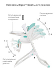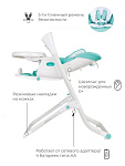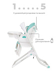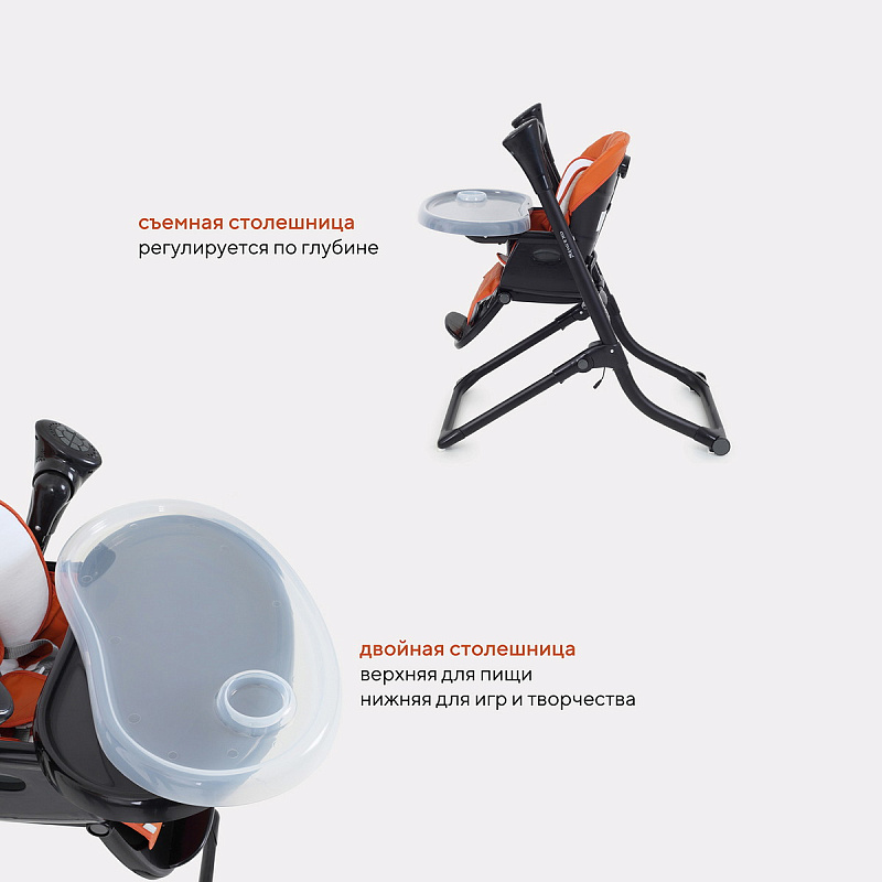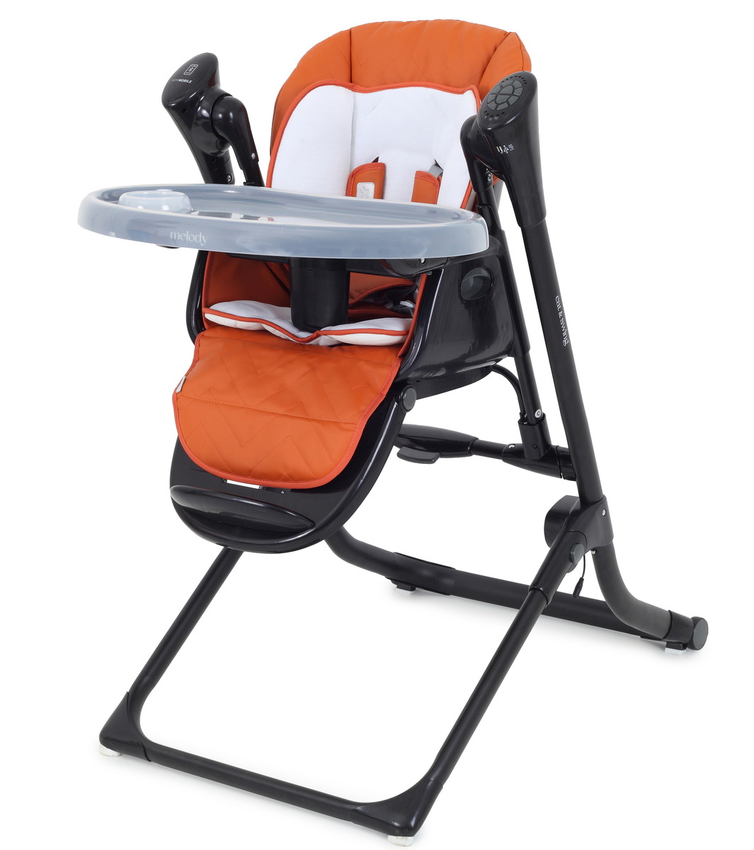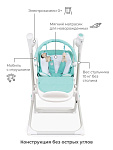 Стульчик для кормления выполнен из качественных материалов, конструкция не имеет острых углов. Сидение произведено из эко-кожи, что облегчает уборку после еды. Столешница съёмная, регулируется по высоте. Для детей с рождения предусмотрена мягкая вкладка-матрасик с ремнями безопасности. Функция электрокачелей с музыкальными эффектами имеет несколько режимов качания.