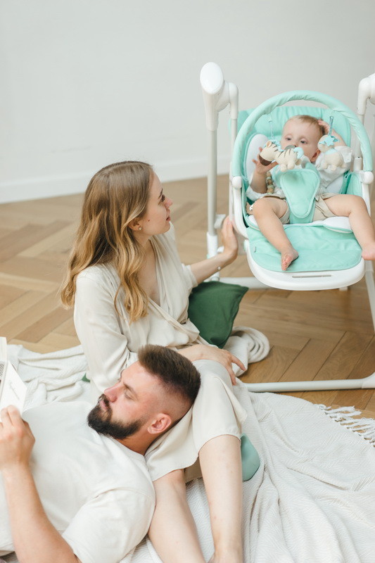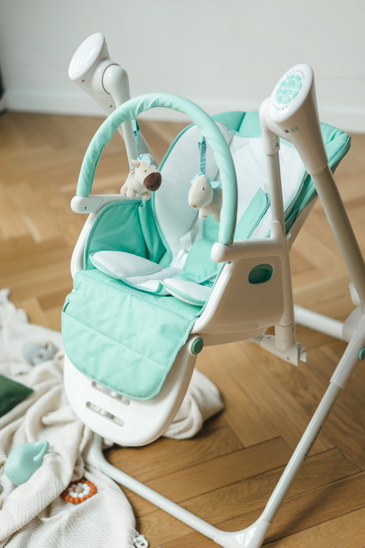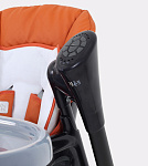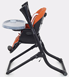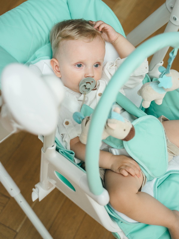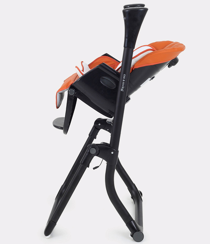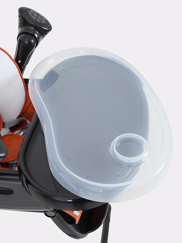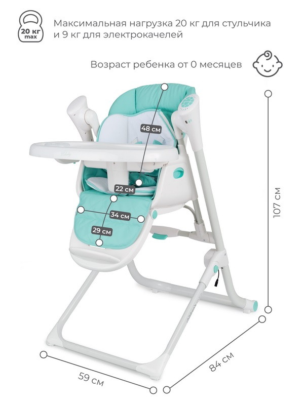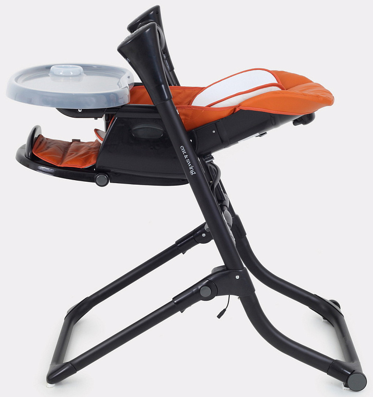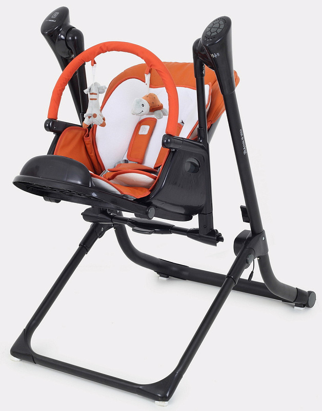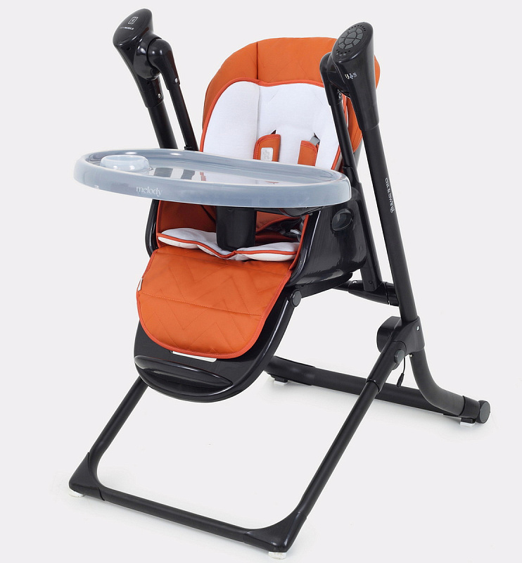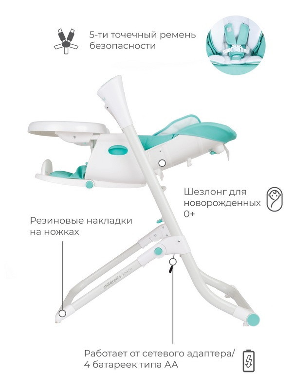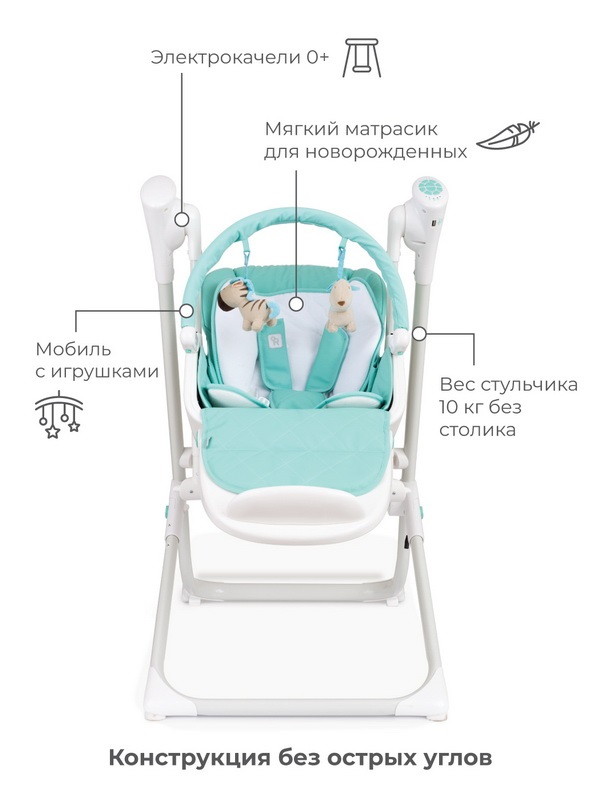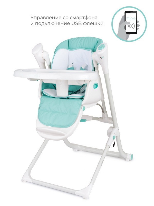 Стульчик для кормления выполнен из качественных материалов, конструкция не имеет острых углов. Сидение произведено из эко-кожи, что облегчает уборку после еды. Столешница съёмная, регулируется по высоте. Для детей с рождения предусмотрена мягкая вкладка-матрасик с ремнями безопасности. Функция электрокачелей с музыкальными эффектами имеет несколько режимов качания.