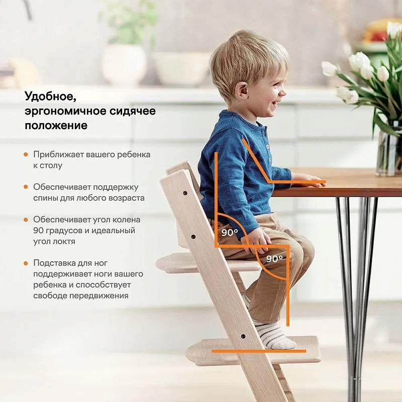 Стул Tripp Trapp® растёт вместе с вашим ребёнком. Продуманная, регулируемая конструкция обеспечивает свободу движений благодаря регулировке глубины и высоты сиденья и подножек. Это означает, что при правильной регулировке вашему ребёнку будет обеспечено удобное и эргономичное положение в любом возрасте.