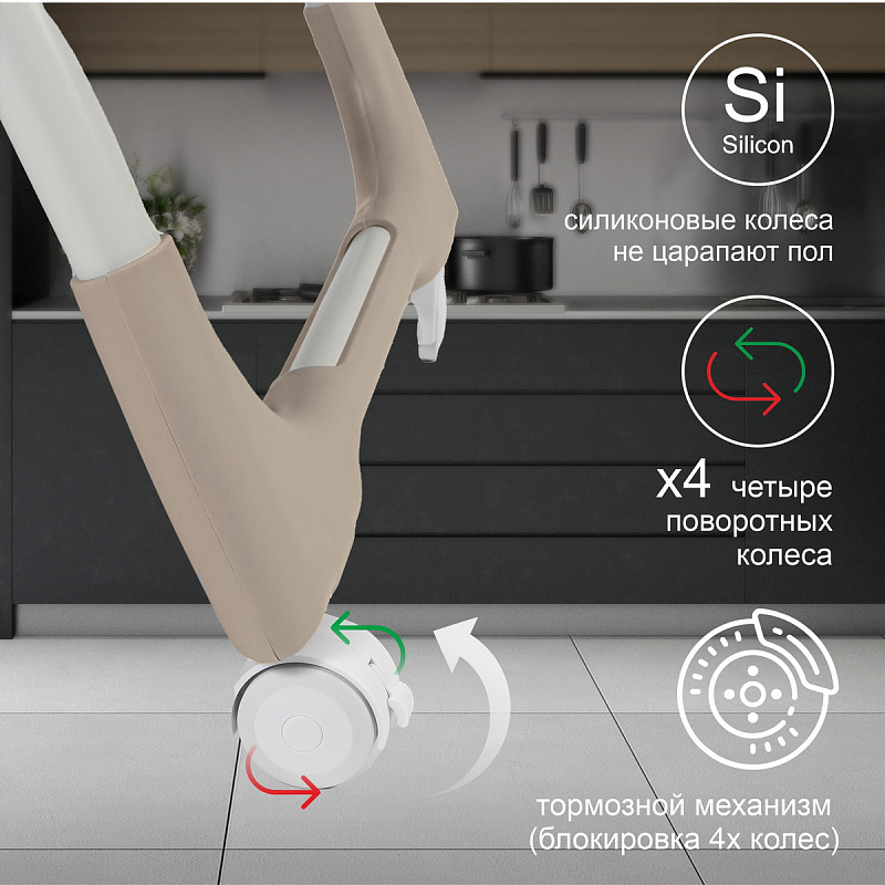 Поворотные колёса с силиконовыми накладками, имеют функцию блокировки.