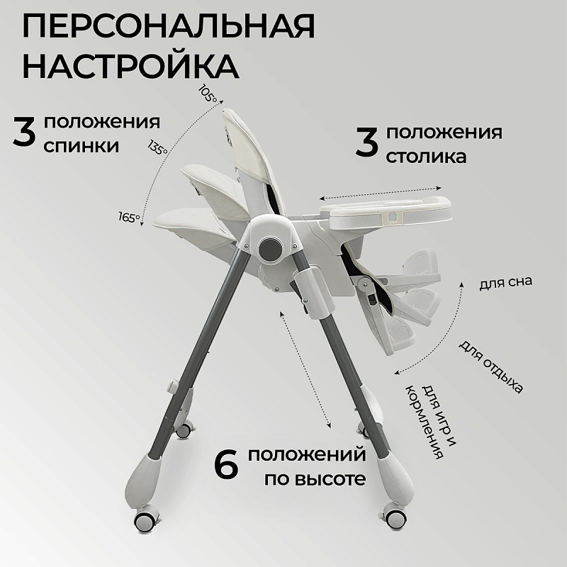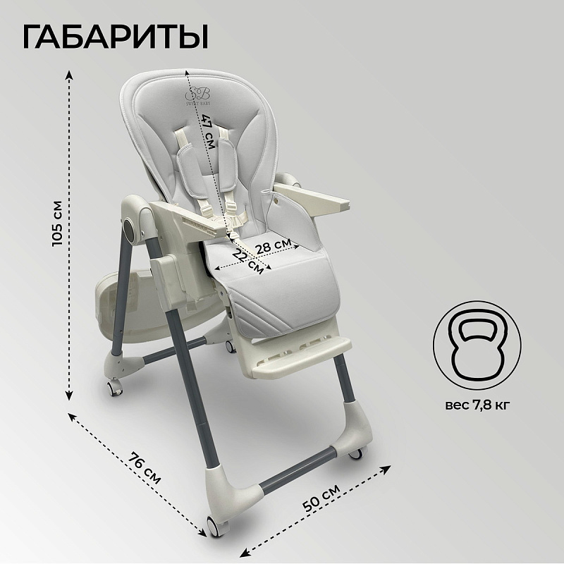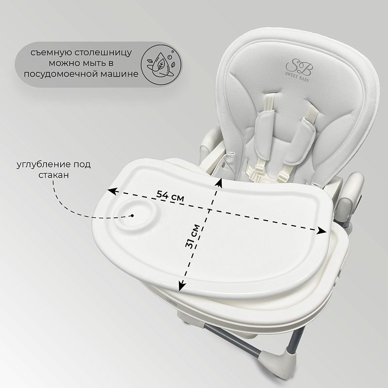 Sweet Baby Roma - это удобный и практичный детский стульчик для кормления, который обеспечивает максимальный комфорт вашему ребёнку. Стульчик изготовлен из высококачественной эко-кожи, которая не только приятна на ощупь, но и легко чистится. Ремни безопасности с мягкими накладками обеспечат безопасность и комфорт вашему ребёнку.Столик оснащен подносом с выемкой для стаканчика, который легко снимается и моется после приема пищи. Столик и ограничители для столика также легко снимаются, что позволяет подвести стульчик к общему столу, чтобы ваш малыш мог участвовать в семейных обедах.Этот универсальный стул имеет 6 уровней регулировки сиденья, 3 уровня регулировки подножки с выемкой для ножек и 3 уровня регулировки спинки, что позволяет настроить его под нужды вашего малыша. Благодаря трансформации в шезлонг, Sweet Baby Roma можно использовать с 4 месяцев.