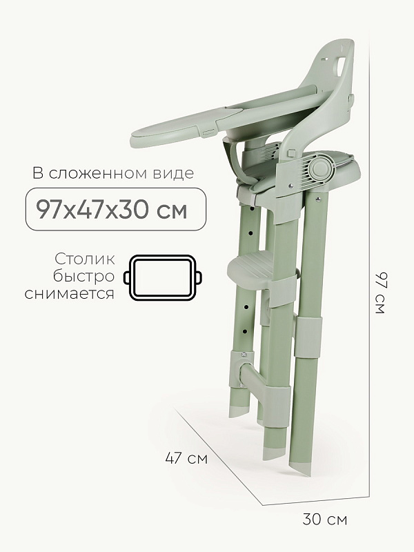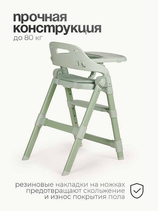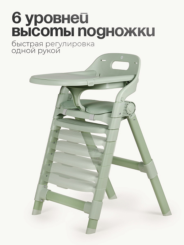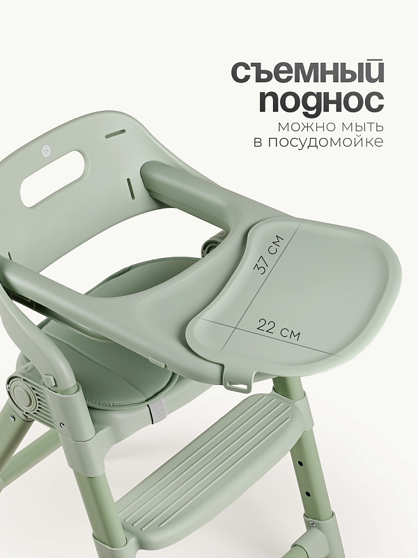 Съемный пластиковый поднос легко снимается для мытья. Столик можно полностью убрать, чтобы использовать стульчик как отдельный для ребенка за общим столом. Стульчик оборудован мягкой накладкой на сиденье из экокожи. Материал гипоаллергенен, прост в уходе и легко очищается от загрязнений.