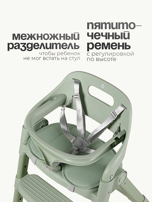 В комплекте 5-точечные ремни безопасности, которые удерживают ребенка и не дают ему самостоятельно выбраться из стульчика. Благодаря прочной конструкции выдерживает нагрузку до 80 кг. Подходит для детей от 6 месяцев до 12 лет.