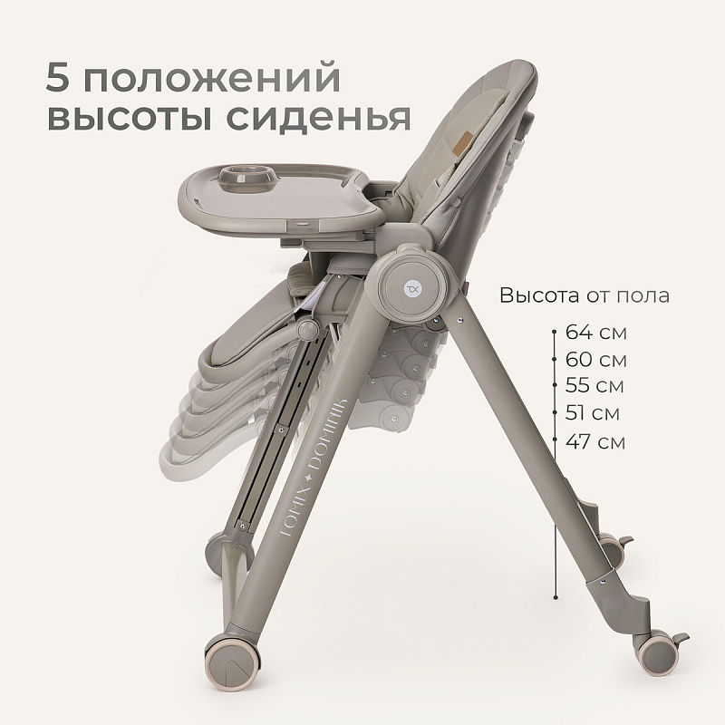 1. Индивидуальные настройки: 5 уровней высоты сиденья, 3 положения спинки (вплоть до режима «шезлонг») и 3 положения подножки. Вы создадите идеальную позу для кормления, игр или отдыха.