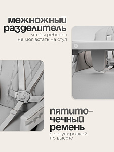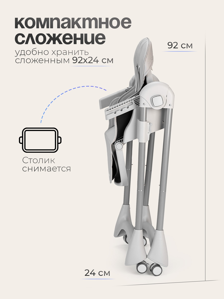 4) Съемный столик с 4 положениями по глубине (16–24 см) — подстраивается под малыша, а удобный поднос легко мыть.
