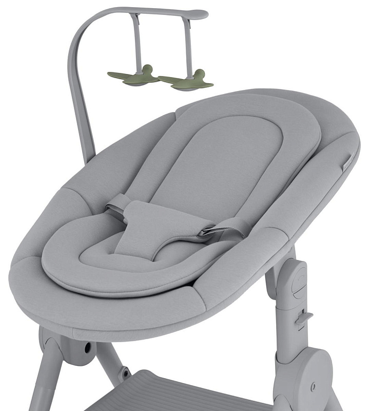 Сиденье для новорожденных оснащено подвесными игрушками с контрастными формами и цветами, которые стимулируют зрение с первых недель жизни.