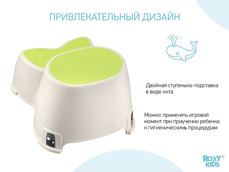 Детская ступенька для унитаза в виде кита поможет приучить подрастающего малыша к самостоятельности. Она поможет усадить его на унитаз, приподнимет на нужный уровень для чистки зубов у раковины и позволит добраться до любых высоких поверхностей. Кроме того, ступеньку можно использовать как многофункциональный стул для мамы и малыша. Система ребер жесткости в основании обеспечит максимальную прочность и надежность, потому что ступенька выдерживает вес более 100 кг. Прорезиненное покрытие ступенек исключает скольжение детских ножек, тактильно приятно и обеспечивает массажный эффект. Защитные накладки в нижней части ступеньки обеспечивают устойчивость конструкции. Благодаря интересному дизайну в виде кита можно применять игровой момент при приучении ребенка к гигиеническим процедурам с использованием ступеньки. В ассортименте ROXY-KIDS имеются несколько цветов данной лесенки-ступеньки.