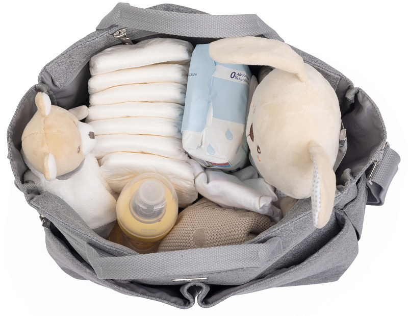 Сумка оборудована 11 карманами, в которых можно хранить ключи, телефон, детские бутылочки и игрушки. Это позволяет всегда иметь под рукой необходимые предметы. Съемный ремешок через плечо с карабином, позволит носить аксессуар в руках или на плече. Крепления на липучках подойдут на любые ручки колясок даже самые толстые