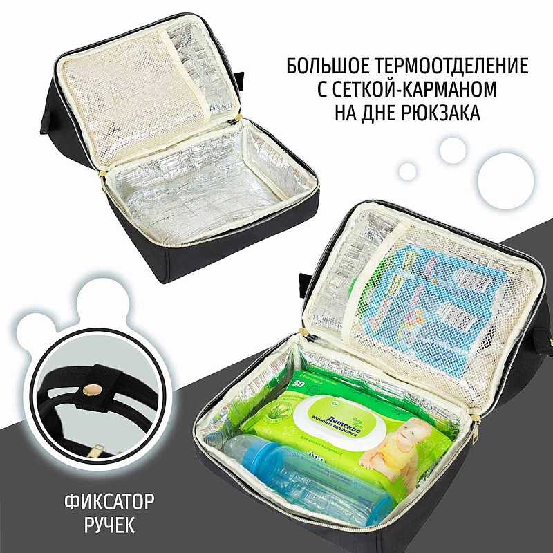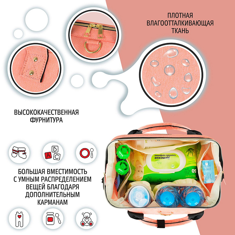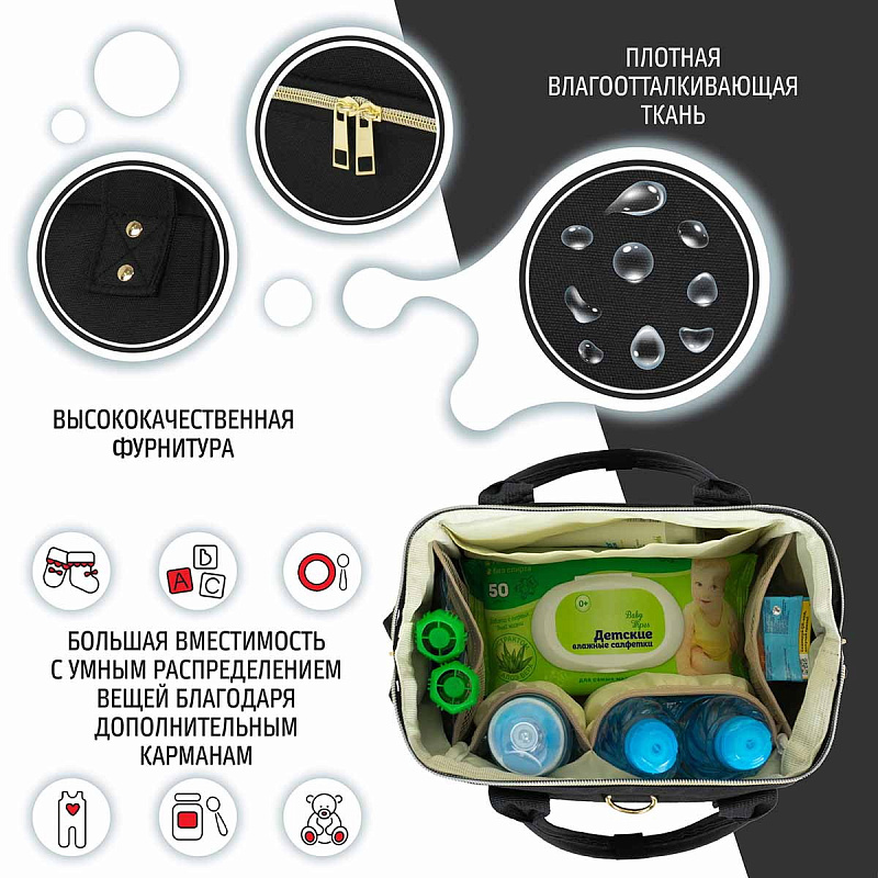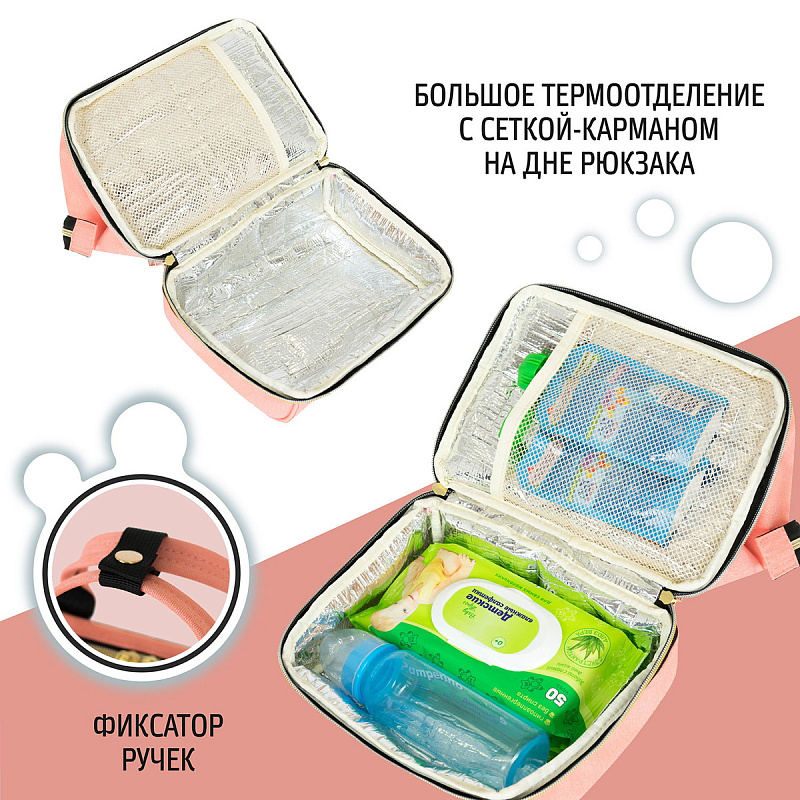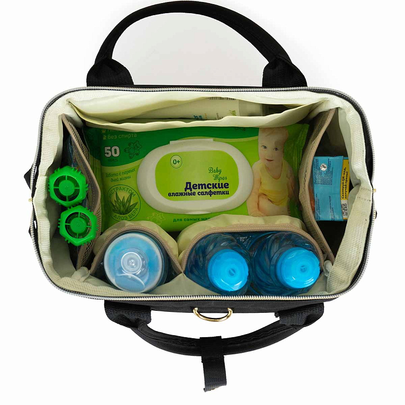 - Для бутылочек и салфеток имеются удобные внутренние карманы с быстрым доступом. Есть карман для документов или телефона.
