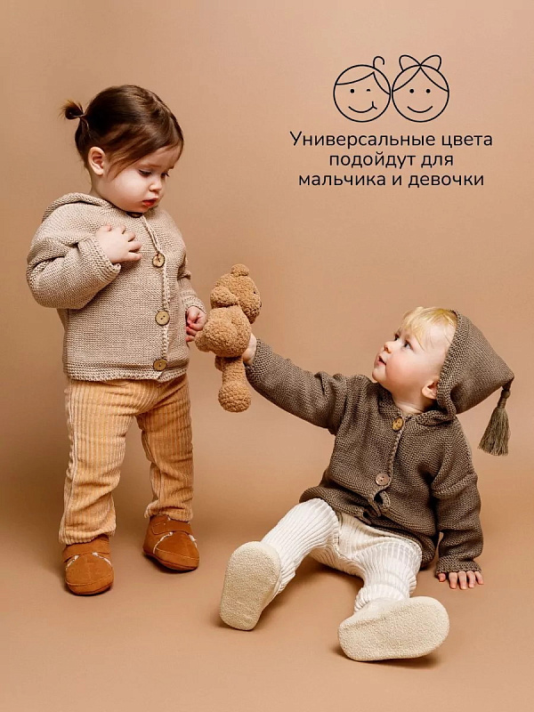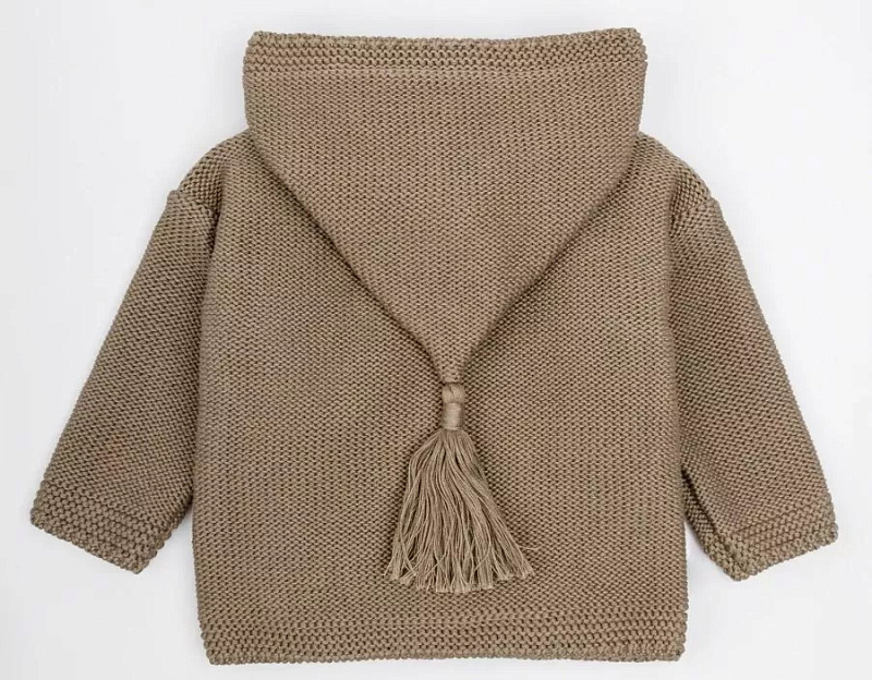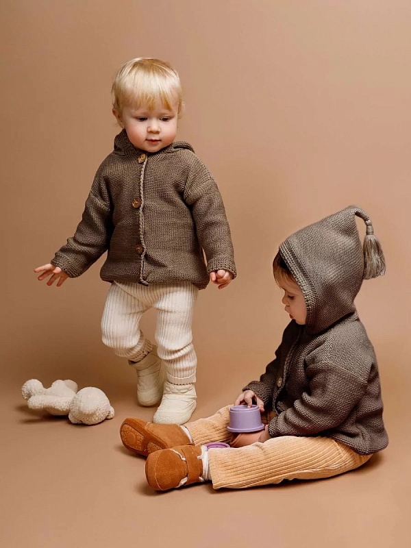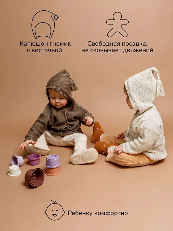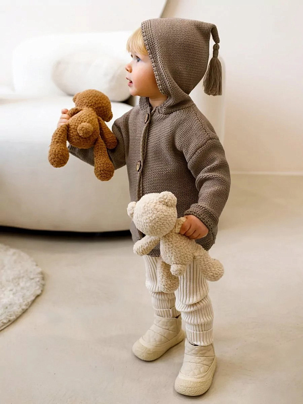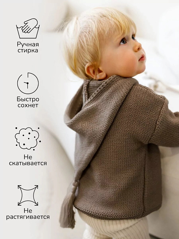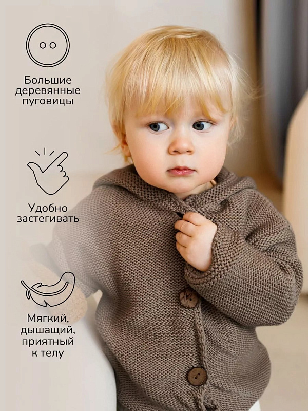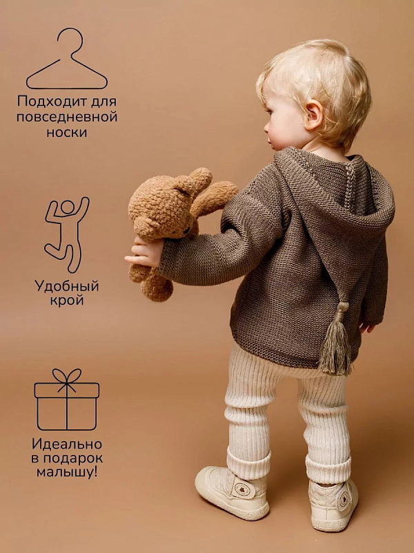 придающей ему невероятную уютную фактуру. За счет универсальных цветов джемпер на пуговицах подойдет, как для мальчика, так и для девочки, а интересная кисточка на капюшоне придадаст милый вид ребенку.