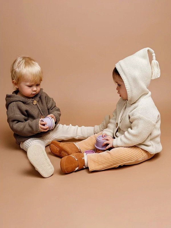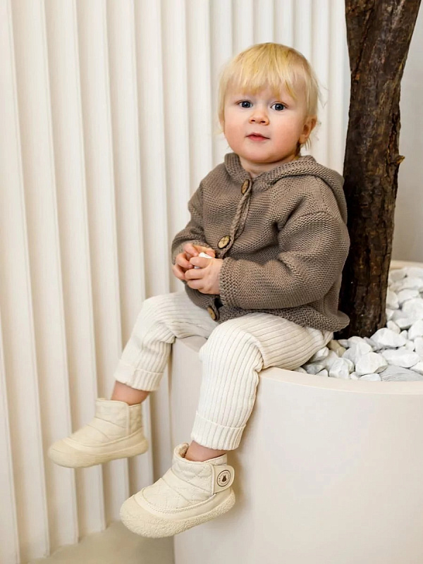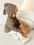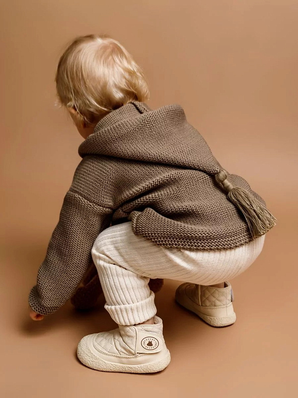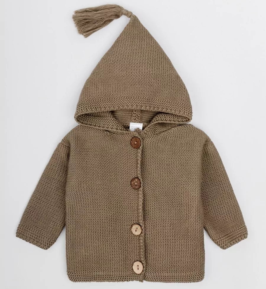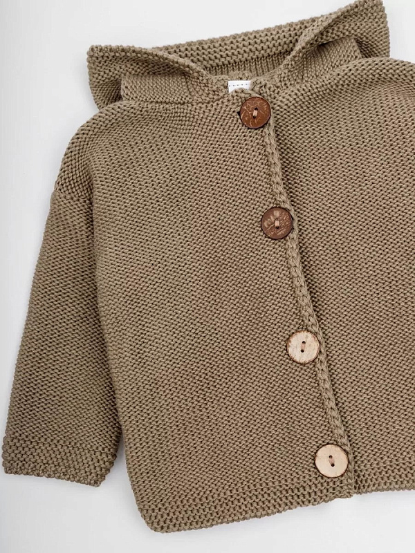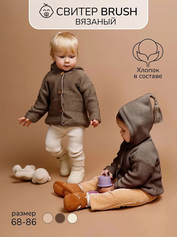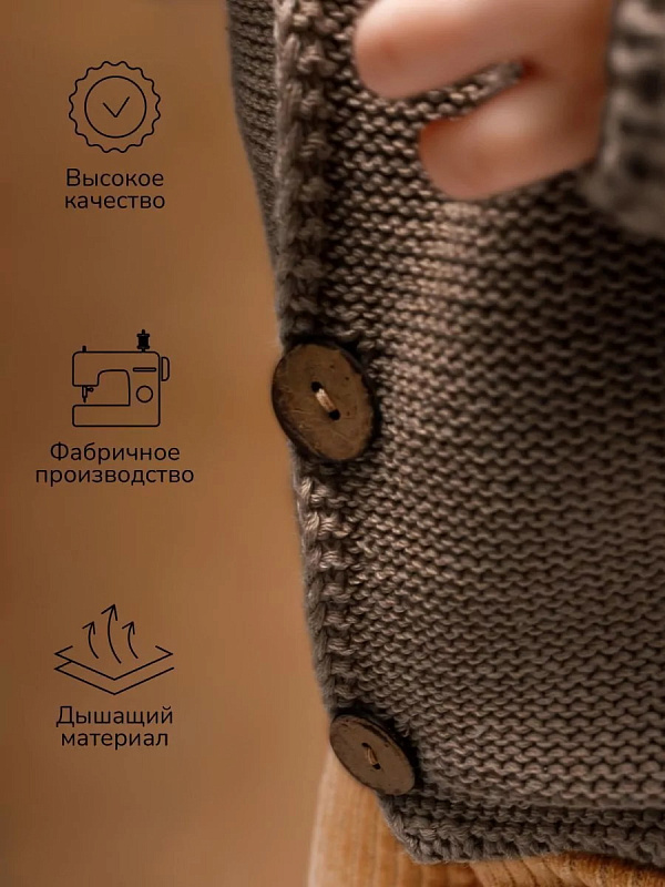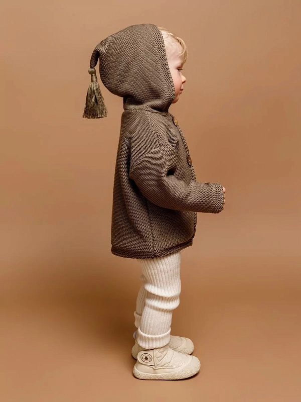 придающей ему невероятную уютную фактуру. За счет универсальных цветов джемпер на пуговицах подойдет, как для мальчика, так и для девочки, а интересная кисточка на капюшоне придадаст милый вид ребенку.