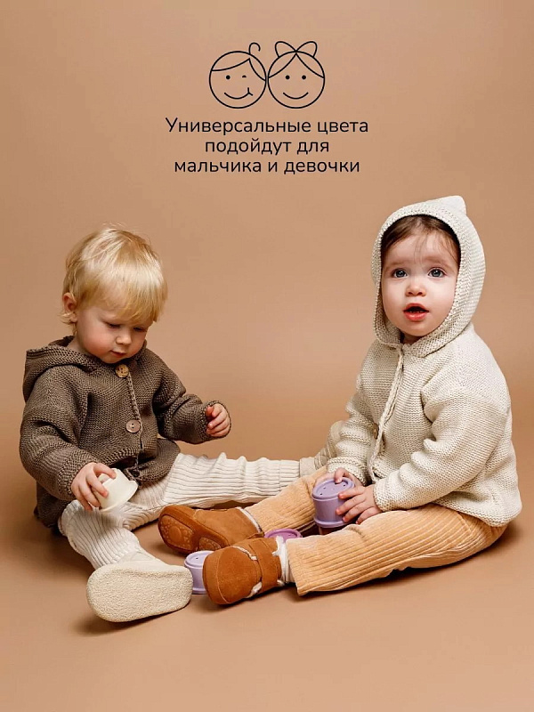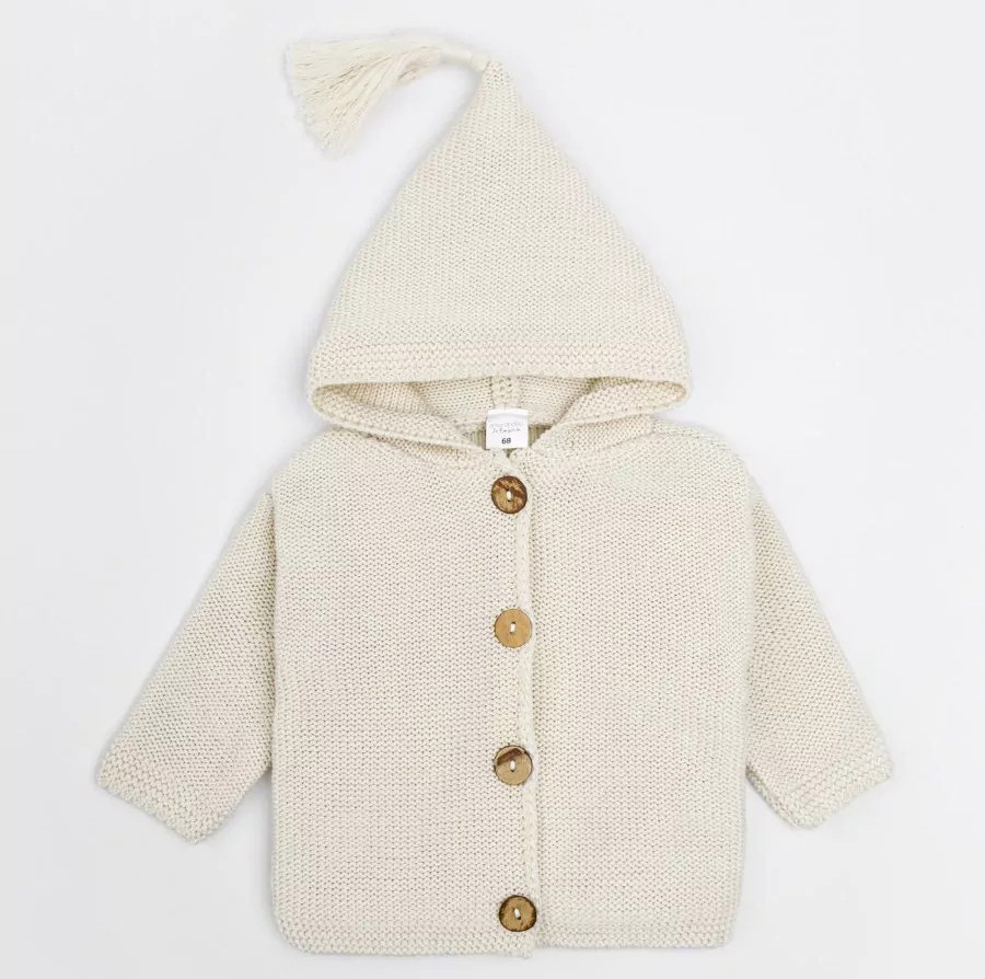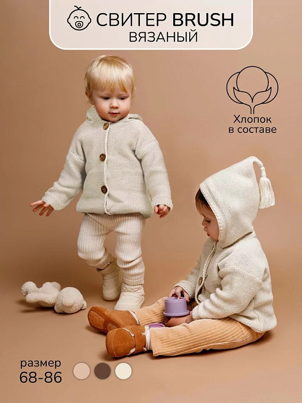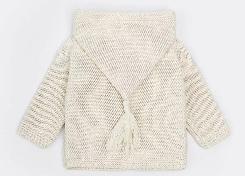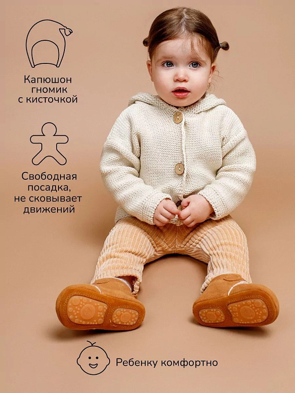 придающей ему невероятную уютную фактуру. За счет универсальных цветов джемпер на пуговицах подойдет, как для мальчика, так и для девочки, а интересная кисточка на капюшоне придадаст милый вид ребенку.