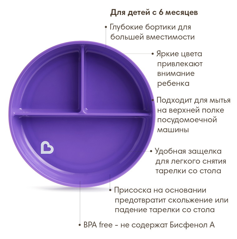 Тарелка детская Munchkin Stay Put на присоске секционная с 6 мес., 11213 фиолетовыйНет оценокХарактеристики